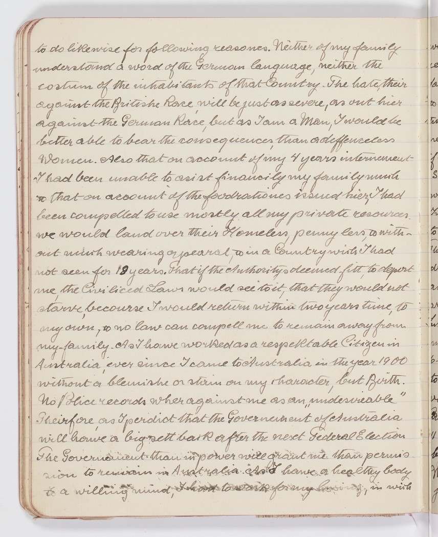 to do likewise for following reasones. Neither of my family understand a word of the German language, neither the costum of the inhabitants of thet Country. The hate their against the British Race, will be just as severe,as out hier against the German Race, but as I am a Man, I would be better ableto bear the consequences, than a defenceless Women. Also that on account of the food rationes issued hier, I had been compelled to use mostly all of my private resources. We would land over their Homeless,penny less, & without much wearing apearal, & in a Country wich I had not seen for 18 years. That if the Authorities deemed fitt, to deport me, the Civiliced Laws would see to it ,trhat they would not starve, becourcse I would return within two years time, to my own, & no law can compel me to remain away from my family. As I have workedas a respectable Citizen in Australi , ever since I came to Australiain the year 1900 without a blemisheor stain on my character, but Birth. No Police records wher against me as an" undesireable" Theirfore, as I predict that the Governement of Australia will have a big sett back after the next Federal ElectionThe Governement then in power will grant me thair permission to remain in Australi a. As I have a healthy body & a willing mind, I look towards living in wich