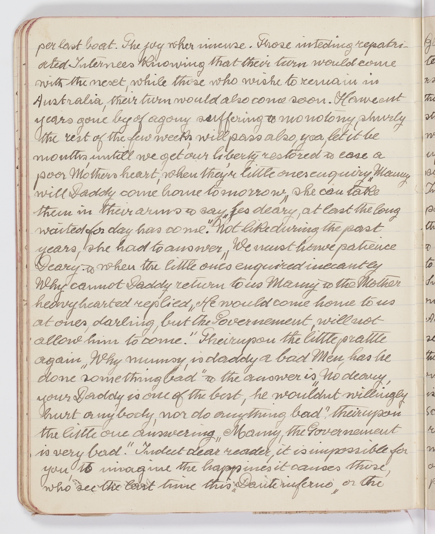 Per last boat. The joy wher immense,Those intending repatriated Internees knowing that their turn would come with the next, while those who wishe to remain in Australia,their turn would come soon. Havent yearts gone by of agony suffering & monotony, shurly the rest of the few weeks, will pass also,yea, let it be months, until we get our liberty restored & ease a poor Mothers heart, when theyre little ones enquiry "Mammy will Daddy come home tomorrow, she can take them in their arms and say "Yes deary, at last the long waited for day has come. "