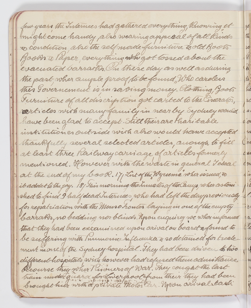 18/This morning the Inmates of the Camp wher astonished to find 9 half dead Internees, who had left the day previously for repatriation with the Mouso Fronter laying in one of the empty barracks, no bedding nor blinds. Upon enquirey we wher informed that they had been examined upon arrival on board & found to be suffering from Pneumonic Influenza & so detained for treatment in one of the Sydney Hospital. They had been driven to two different hospitals, wich however had refused them admittance becourse they wher Prisoners of War. They cought the last train under guard for Liverpool from their they had been brought hier with a private Motor Car. Upon arrival each