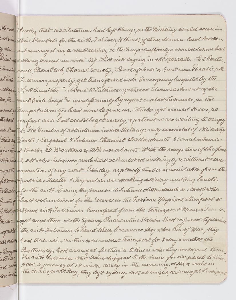 lucky that 1600 Internees had left Camp, as the Military could send in their blankets for the sick. I shiver to think, if these disease had broken out amongst us, a week earlier, as the CampAuthoritys would have had nothing to assist us with. 20/ Still sick laying in all Barracks. So 2 Restaurants, Chess Club, Choral Society, School of Arts & Austrian Theater,all Internees property, got transferred intoEmergency hospital by the Sick Committee. "About 10 Internees gathered Strawsacks out of the rubbish heap & used formerly by repatriated internees,as the Camp Authoritys had none to give us. Straw gort issued to us, so as fast as a bed could be got ready, a patient wher waiting to occupy it. The Number of attendance inside the Camp only consisted of 1 Military Doctor 1 Sergeant 4 Internee Chemist 50 Attendants 4 Stretcher bearers 3 Cooks 20 Workers & 10 Rouseabouts. With the exception of the first 2 all other Internees, wich had voluntared willingly & without renumeration of ant sort. This day . as plenty timber is available from the AiustrianTheater 4 Carpentersworking all day making bunks for the sick. During the forenoon 16 Internees Attendants & 1 Cook who had voluntared for the Servicein the Garison Hospital Liverpool to attend sick Internees transferred transferred from the transport Mousos Groules got send their. As the SydneyQuarantine Station had refused to permit the sick Internees to land their, becourse they wher Pris of war, they had to remain on this overcrowdet transport for 3 days until the Authoritys ha d arranged for them to know wher theycould put them. The sick internees wher transhipped to the train for dispatch to Liverpool, a journey of 18 miles early in the morning. After a wait in the carriages all day. They left Sydney late at night, arriving at Liverpool