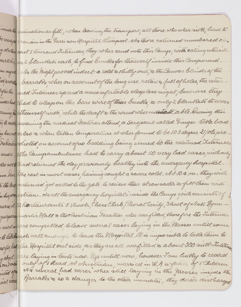 As the night proved indeed a cold & chilly one & the canvas blinds of the barracks wher on account of the long use rotten & full of holes, the returned Internees spend a uncomfortable sleepless night, becourse they had to,sleep on the bare wire of their bunks, & only 2 blankets to cover themselves with, whilethe draft & the windwher unsatiable. During this evening the Medical Doctors attend, a Sergeant called Ginger toke badalso & when taken temperature it wher foundto be 103 degree 21/As predicted, on account of no beddingbeing issued to the returned Internees the camp ambulance had to carry about 50 very bad cases, wich only had returned the day previously healthy into ther emergency hospital. The rest, I most cases,having caught a severe cold. At 10 a. m. they wich returned got called to the gate to receive their straw sacks & fill themwithstraw. As all the emergency hospitalsinside the Camp wich consists of 2 Restaurants 4 shools, Chess Clib, Choral Socity,School of Arts Gymnastic Hall & the Austrian Theatherwher over filled, therefore the Internees are compelled, to leaveseveral cases laying in the messes until some gets well enough toleave the Hospital. It is impossibleto take them to the Hospital outside, as theyare all overfilled & about 300 sick Internees are laying in tents now. Up until now, however I am lucky to record only 1 dead. A Austrian, married in W. A & father of 5 children. As several bad cases wher still laying in the messes inside the Barracks & so a danger to the other inmates, they doctor discharged