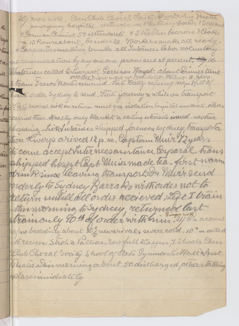 20/more sick. Chess club. Choral society. Austrian Theater emergency hospital. Attendance1 Military Doctor 1 Sergeant 4 German Chemist 50 Attendants. 4 Stretcher bearers 3 Cooks 10 Rousabouts besides 20 Workers make all ready 4 Carpenters making bunks all Internees labor voluntary. No renumeration by anyone promised at present. /16 Internees called to Liverpool Garrison Hosptabout dinner time. 2 train Grasos Montes returned, 1000 the night most go Bunks or strawto sleep. State wally refusing to sign Bill of health Order Sydney to send. State journry & while on transportState several sickonreturn. must go isolation hospitalimidiate, otherscarrier dthei. Healthy only blankets & eating utensils issued. no other bedding. Sick internees shipped forenoonSydney, transportation Liverp arived12 p. m. Captain Muir 72 years to come accept Internees assistance Corporal. transhipped hosptCapt Muir made tea. first warm drink since leaving transport. Dr Muirsend orderly to Sydney barrackswith ordernot to returnuntill all order received. Left 1 train this mornig to Sydney, returned last train only 90th of order with him. Ginger sick.