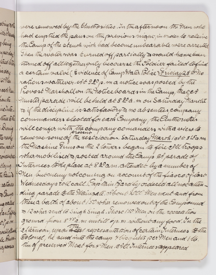 were removed by the Authorities. In the afternoon the Men who had emptied the pans on the previous night, in order to relieve the Camp of the stench wich had become unbearable were arrested Then the water was turned off partially & would harve been turned off altogether, only becourse the Soldier failed to find a certain valve (Evidence of Camp Water Police) Friday 28th No rations wathever. At 930 p. m a notice was posted by the Provost Marshall on the Notice boards in the Camp, that, A Muster parade will be held at 830 a. m on Saturday Marcht & if the discipline is satisfactory & no absentees, company comanders elected for each Company, the Authorities will confer with the company commanders with a view to remove some of the present restriction. Saturday March 1 A 815 a. m the Mashine Guns on the 2 towers began to fire. All troops wher mobilised & posted around the Camp. A parade of Internees toke place at 830 a. m. attendet by a number of Men, but many not coming on account of the fiasco of last Wednesdays roll call. Captain Bardly ordered all non attending parade to the Maingate. About 2000 Men went and from these a batch of about 150 wher removied out of the Compound & 12 wher sent to Singh Singh. Those 150 Men, on the recreation ground from 845 a. m untill 6 p. m. without any food. In the afternoon, upon a cert the representation of certain Internees to the Colonel, he send into the camp 7 biscuits per Men and 1 lb. Tin of preserved Meat for 4 Men. All Internees appeared