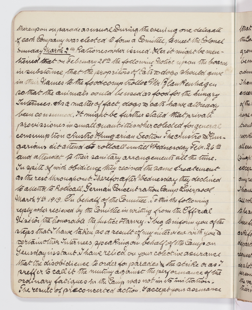 thereupon on parade as usual. During the evening one delegate of each Company was elected to form a Comittee, to meet the Colonel Sunday March 2th Rationes wher issued. Her it might be mentioned that on February 28th the following Notice upon the boards in substance, that the propritors of Cats & dogs should give in their Names to the food-comptroller Mr Blankenhagen so that the animals could be used as food for the hungry Internees. As a matter of fact, dogs & cats haive allreadly been consumed. It might be further stated that private provissiones in small quantities wher collected for general consumption Austro Hungarian Section The Austro & Hungarians dit attend to rollcall until Wednesday Febr. 26th and attendet to their sanitary arrangements all the time. In spite of with obedience they received the same treatement as the rest throughout. Therefor after Wednesday they declined to attend to Rollcall. German Concentration Camp Liverpool March 7th 1919. On behalf of the Comittee. To this the following reply wher received by the Comittee in writing from Official Visitor, the honourable the Justice Harvey. I beg to inform you of the steps that I have taken, as a result of my interview with you & certain other Internees, speaking on behalf of the Camp on Tuesday instant. I have relied on your collective assurance that the disobidience to order for parades & the strike or as I preffer to call it the mutiny against the performance of the ordinary fatigues in the Camp was not in its initiation. The result of the preconcerted action. I accept your assurance