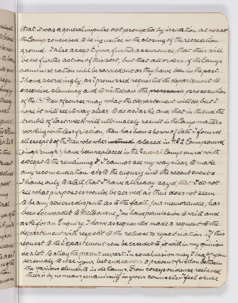 ed requested the departement to excercise clemency and to withdraw the presecutli prosecution of the 141 Men of course may what the departement will do, but I hope it will see its way clear to do as I aske and that in the end the trouble of last week will ultimately result in the Camp matters working with less friction, than has been shown of late. I found all except 3 of the Men who wher interned placed in No 2 Compound (Singh Singh) have been replaced in the General Compound with except to the remaining 7, I cannot see my way clear to make any recomendation. As to the enquiry into the recent events I have only to state, that I have allready sayd, that I do not see what purpoases would be served as their does not seem to be any serious dispute as to the facts. Your memoranda, has been forwardet to Melbourne. You haive permission to write and aske for an Enquiry. I have as requested made a request to the departement with respekt to the release & repatriation. If this request to the Departement can be accedet to, it will in my opinion do a lot to allay the present unrest. In conclussion may I beg of you personaly to use your bst endeavors & prevent friction between the various elements in the Camp. From correspondence recieved their is by no means, unanimity in your counsels. I feel shure