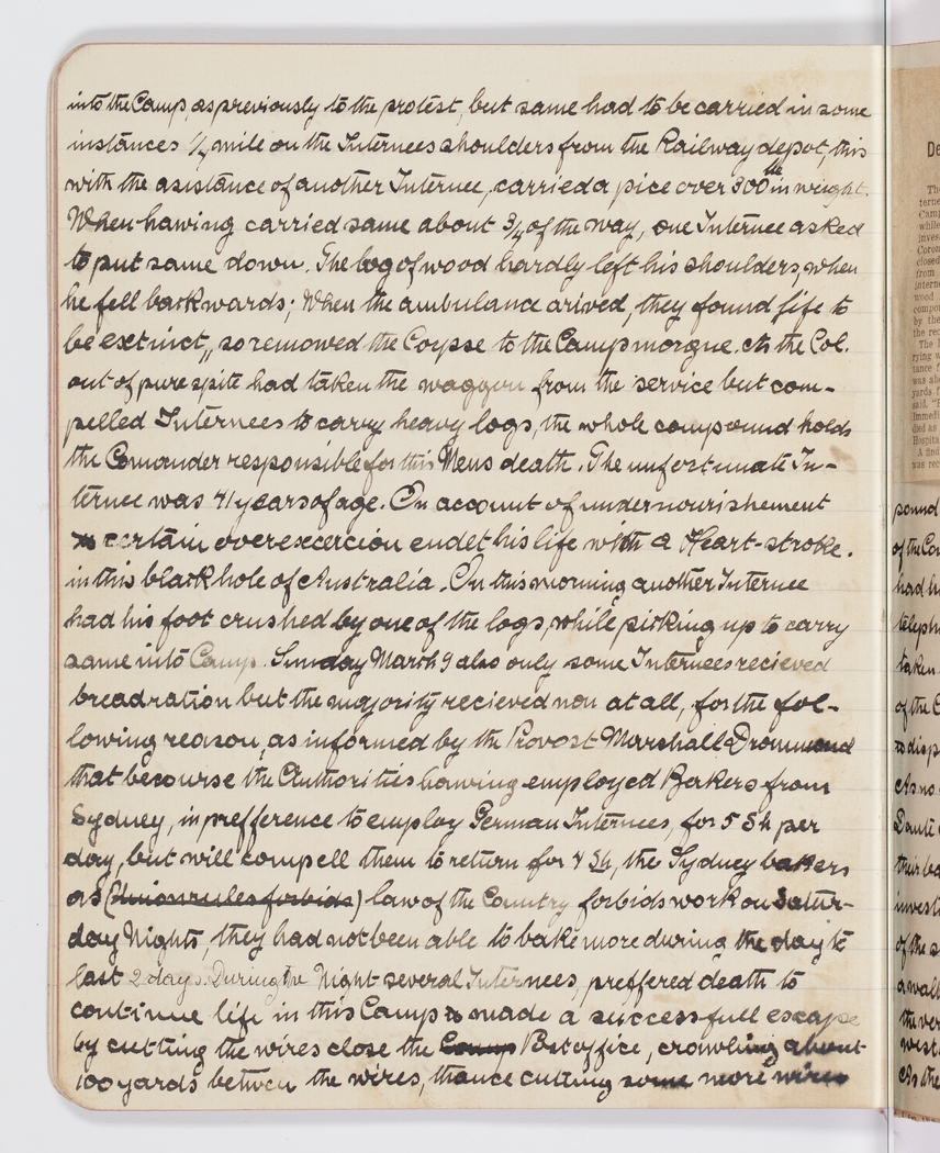 into the Camp, as previously to the protest, but same had to be carried in some instances ¼ mile on the Internees shoulders from the Railway depot, this with the asistance of another Internee, carried a pice over 300 in weight. When having carried same about ¾ of the way, one Internee asked to put same down. The bag of wood hardly left his shoulders, when he fell backwards; when the ambulance arived, they found life to be extinct" so remoived the Corpse to the Camp morgue. As the Col. Out of pure spite had taken the wagon from the service but compelled Internees to carry heavy logs, the whole compound holds the Comander responsible for this Mens death. The unfortunate Internee was 71 years of age. On account of undernourishement & certain overexcercion endet his life with a Heart-stroke. in this blackhole of Australia. On this morning another Internee had his foot crushed by one of the logs, while picking up to carry same into Camp. Sunday March 9 also only some Internees received breadration but the majority received non at all, for the following reason, as informed by the Provost Marshall Drommond that becourse the Authorities haiving employed Bakers from Sydney, in prefference to employ German Internees, for 5 Sh per day, but will compel them to return for 7 Sh, the Sydney bakers as ([indecipherable]) law of the Country forbids work on Saturday Nights, they had not been able to bake more during the day to last 2 days. During the Night several Internee, preffered death to continue life in this Camp & made a successfull escape by cutting the wires close the Camp Post office, crawling about 100 yards betwen the wires, thence cutting some more wires