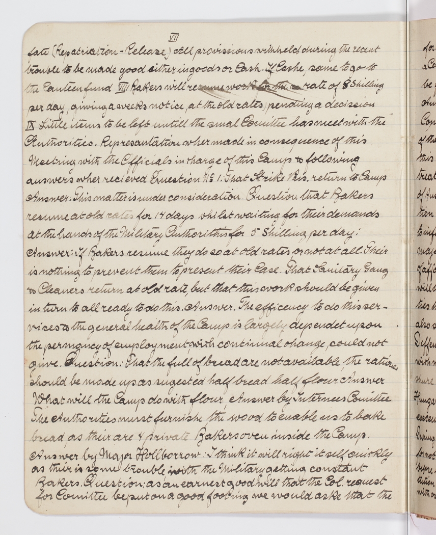 fate (Repatriation – Release) VII All provisions withheld during the recent trouble to be made good either in goods or Cash. If Cashe, same to go to the Canteen fund. VIII Bakers will resume work for the one rate of 8 shilling per day, giving a weeks notice, at the old rates, pending a decision IX Little items to be left until the small Comittee has meet with the Authorities. Representation wher made in consequence of this Meeting with the Officials in charge of this Camp & following answers wher received Question No. 1. That Strike Pris. Return to Camp Answer: This matter is under consideration. Question that Bakers resume at old rates for 14 days whilst waiting for their demands at the hands of the Military Authorithis for 5 shilling per day: Answer: If Bakers resume they do so at old rates or not at all. Their is nothing to prevent them to present their Case. That Sanitary Gang & Cleaners return to old rate, but that this work should be given in turn to all ready to do this. Answer. The efficiency to do this services to the general health of the Camp is largely dependet upon the permancy of employment, with continual change, could not give. Question: That the full of bread are not available, the rationes should be made up as sugested half bread half flour Answer What will the Camp do with flour, Answer by the Internees Comittee The Authorities must furnish the wood to enable us to bake bread, as their are 4 private Bakers oven inside the Camp. Answer by Major Hollborrow: I think it will right itself quickly as their is some trouble with the Military getting constant Bakers. Question: as an earnest goodwill that the Col. Request for Comittee be put on a good footing we would aske that the