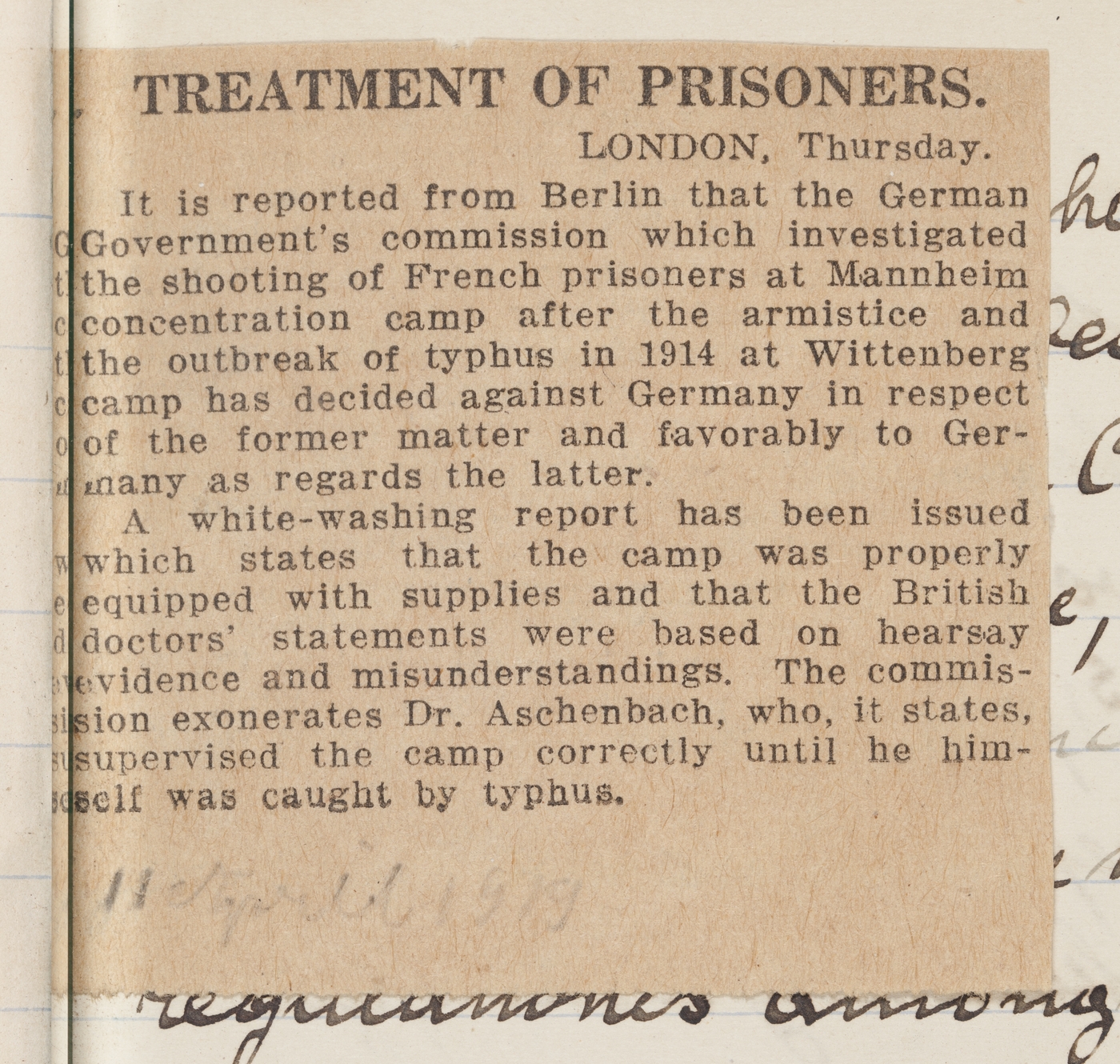 A white-washing report has been issued which states that the camp was properly equipped with supplies and that the British doctors' statements were based on hearsay evidence and misunderstandings. The commission exonerates Dr. Aschenbach, who, it states, supervised the camp correctly until he himself was caught by typhus.