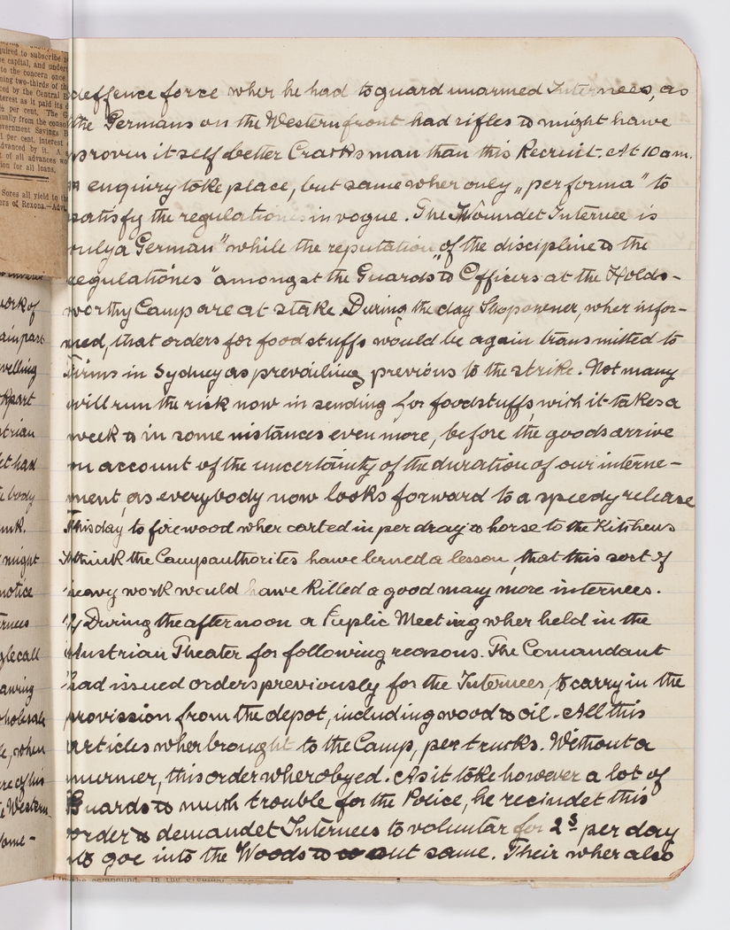 deffence force wher he had to guard unarmed Internees, as the Germans on the Western front had rifles & might have provin itself better Cracksman than this Recruit. At 10 am. a enquiry took place, but same wher only "per forma" to satisfy the regulationes in vogue. The Woundet Internee is only a German "while the reputation of the discipline & the regulationes "amongst the Guards" & Officers at the Holdsworthy Camp are at stake. During the day Shop owner, when informed, that orders for foodstuffs would be again transmitted to Firms in Sydney as prevailing previous to the strike. Not many will run the risk now in sending for foodstuffs, wich it takes a week & in some instances even more, before the goods arrive on account of the uncertainty of the duration of our internement, as everybody now looks forward to a speedy release This day to firewood wher carted in per dray & horse to the Kitchens I think the Camp authorites have learned a lesson, that this sort of heavy work would have killed a good many more internees. 12/ During the afternoon a Puplic Meeting wher held in the Austrian Theater for following reasons. The Comandant had issued orders previously for the Internees, to carry in the provission from the depot, including wood & oil. All this articles wher brought to the Camp, per trucks. Without a murmur, this order wher obyed. As it toke however a lot of Guards & much trouble for the Police, he recindet this order & demandet Internees to voluntar for 2 s per day to goe into the Woods to co cut same. Their wher also