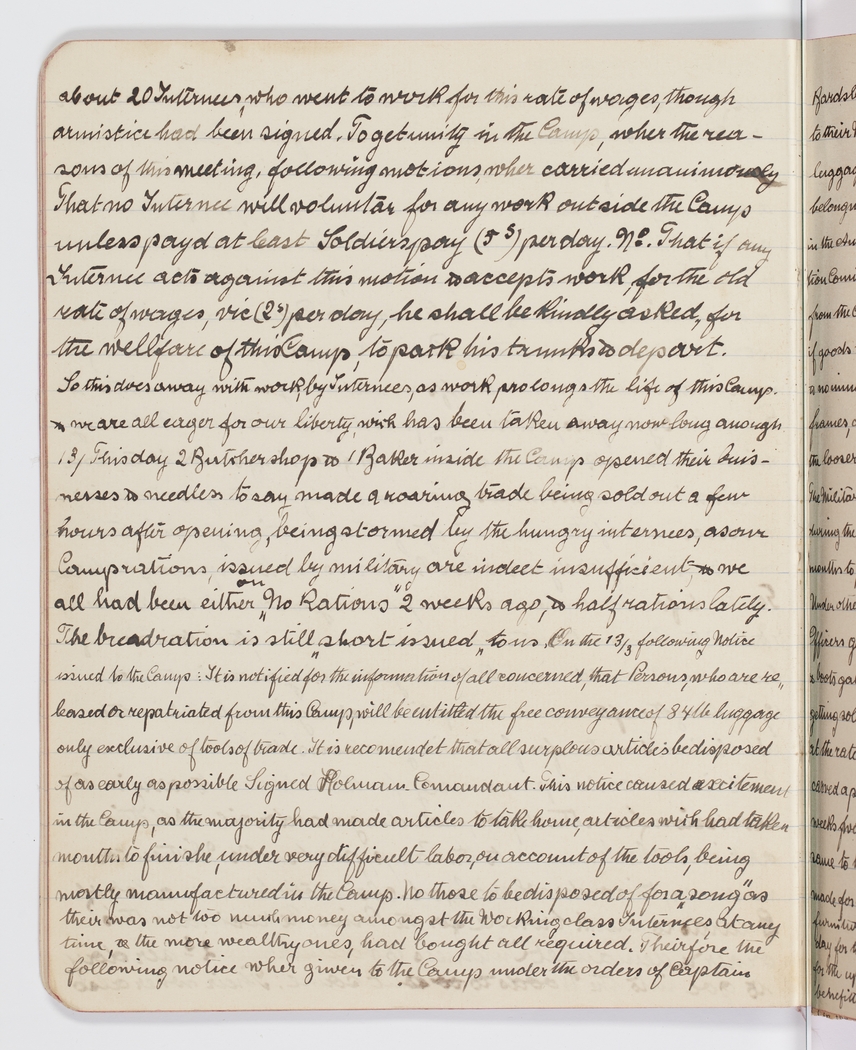 about 20 Internees, who went to work for this rate of wages, though armistice had been signed. To get unity in the Camp, wher the reasons of this meeting, following motions wher carried unanimously That no Internee will volunter for any work outside the Camp unless payd at least Soldierspay (5 s) per day. No. That if any Internee acts against this Motion & accepts work for the old rate of wages, vie (2 s) per day, he shall be kindly asked, for the wellfare of this Camp, to pack his trunks & depart. So this does away with work by Internees, as work prolongs the life of this Camp. & we are all eager for our liberty, wich has now been taken away long anough 13/ Friday 2 Butcher shop & 1 Baker inside the Camp opened their buisnesses & needless to say made a roaring trade being sold out a few hours after opening, being stormed by the hungry internees, as our Camp rations, issued by military are indeet insufficient, & we all had been either on "No Rations" 2 weeks ago, & half rations lately. The breadration is still "short issued" to us. On the 13/5 following Notice issued to the Camp: It is notified for the information of all concerned, that Persons who are released or repatriated from this Camp, will be entittled the free conveyance of 84 lb luggage only exclusive of tools of trade. It is recomendet that all surplous articles be disposed of as early as possible Signed Holman. Comandant. This notice caused excitement in the Camp, as the majority had made articles to take home, articles wich had taken months to finishe, under very difficult labor, on account of the tools, being mostly manufactured in the Camp. No those to be disposed of for a "song" as their was not too much money amongst the Working class Internees, at any time, & the more wealthy ones, had bought all required. Theirfore the following notice wher given to the Camp under the orders of Captain