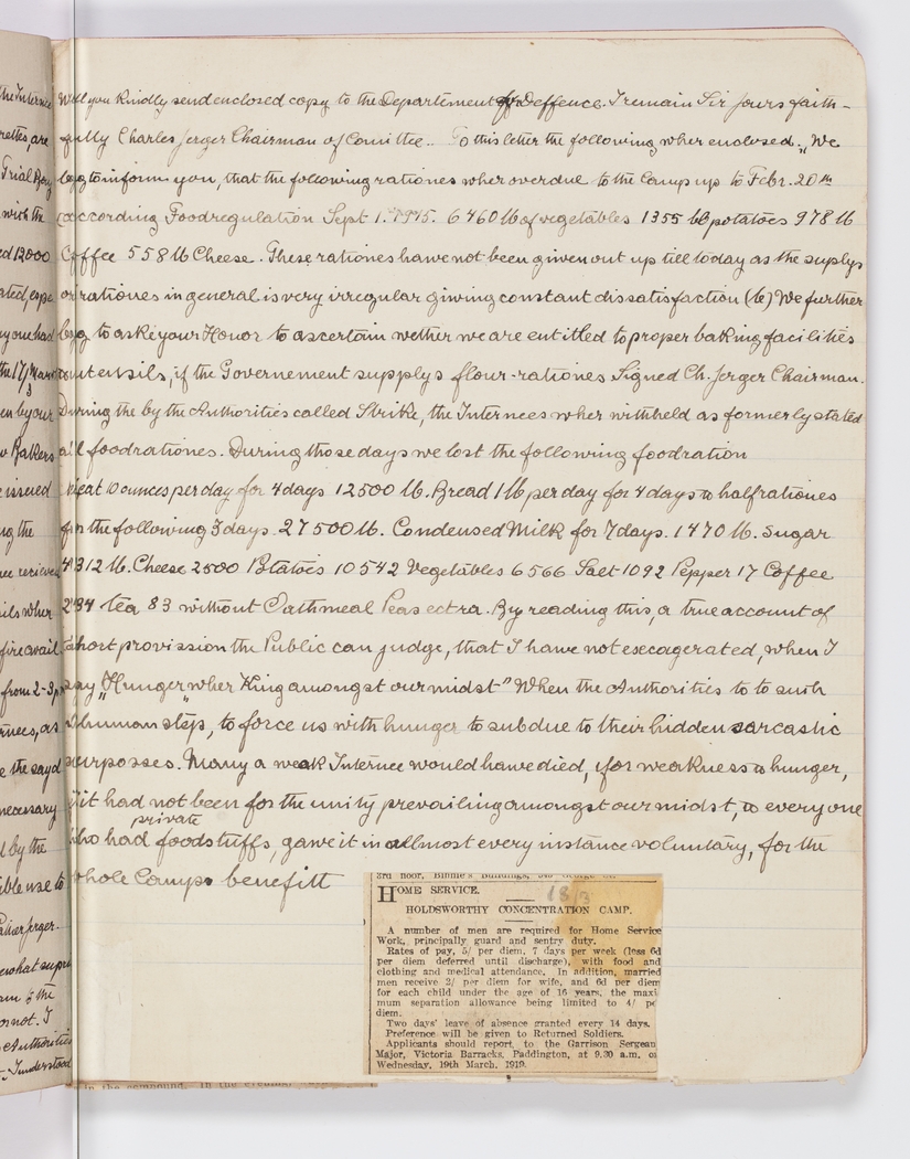 Will you kindly send enclosed copy to the Department of Deffence. I remain Sir yours faithfully Charles Jerger Chairman of Comittee. To this letter the following were enclosed. "We beg to inform you, that the following rationes were overdue to the Camp up to Febr. 20th (according Foodregulation Sept. 1 1915. 6760 lb of vegetables 1355 lb potatoes 978 lb Coffee 558 lb Cheese. These rationes haive not been given out up till today as the suplys of rationes in general is very irregular giving constant dissatisfaction. (b) We further beg to aske your Honor to ascertain wether we are entitled to proper baking facilities & utensils, if the Governement supplys flour-rationes Signed Ch Jerger Chairman. During the by the Authorities called Strike, the Internees wher withheld as formerly stated all foodrationes. During these days we lost the following foodration Meat 10 ounces per day for 4 days 12500 lb. Bread 1 lb per day for 4 days & half rationes for the following 3 days. 27500 lb. Condensed Milk for 7 days. 1470 lb. Sugar 4312 lb. Cheese 2500 Potatoes 10542 Vegetables 6566 Salt 1092 Pepper 17 Coffeee 237 tea 83 without Oathmeal Peas extra. By reading this, a true account of short provission the Public can judge, that I haive not excagerated, when I say "Hunger" wher King amongst our midst" When the Authorities to to such inhuman steps, to force us with hunger to subdue to their hidden sarcastic purposes. Many a weak Internee would have died, for weakness & hunger, if it had not been for the unity prevailing amongst our midst, to every one who had private foodstuffs, gaive it in allmost every instance voluntary, for the whole Camps benefit.