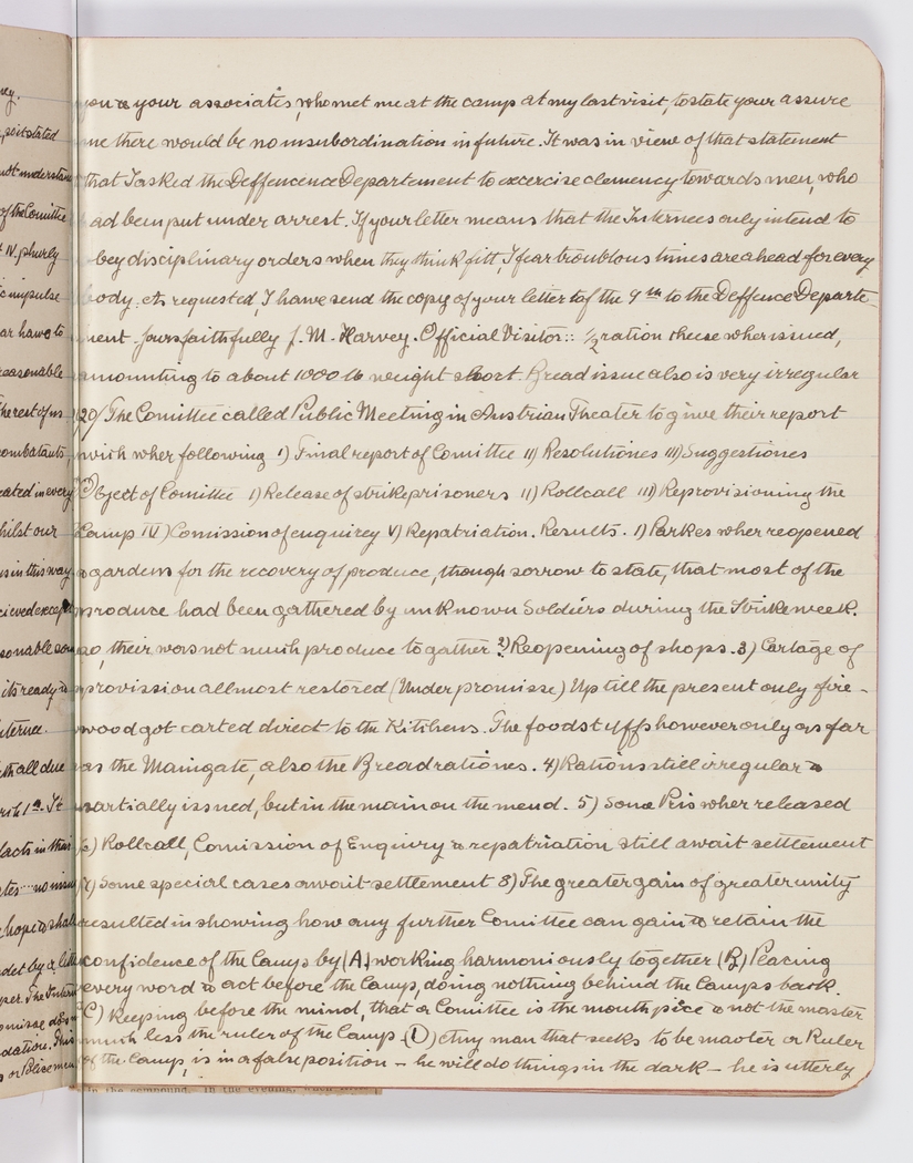 you & your associates, who met me at the camp at my last visit, to state your assure anc there would be no insubordination in future. It was in view of that statement that I asked the Deffencence Department to exercise clemency towards men, who had been put under arrest. If your letter means that the Internees only intend to obey disciplinary orders when they think fitt, I fear troublous times are ahead for every body. As requested, I have send the copy of your letter of the 9th to the Deffence Departement . Yours faithfully J. M. Harvey. Official Visitor ::1/2 ration cheese when issued, amounting to about 1000 lb weight short. Bread issue is also very irregular 20/ The Comittee called Public Meeting in Austrian Theater to give their report wich were following I) Final report of Comittee II) Resolutiones III) Suggestiones Object of Comittee I) Release of strike prisoners II) Rollcall III) Reprovisioning the Camp IV) Comission of enquirey V) Repatriation. Results. 1) Parkes wher reopened & gardens for the recovery of produce, though sorrow to state, that most of the produce had been gathered by unknown Soldiers during the Strike week, so, their was not much produce to gather. 2) Reopening of shops. 3) Cartage of provission allmost restored (Under promisse) Up till the present only firewood got carted direct to the Kitchens. The foodstuffs however only as far as the Maingate, also the Bread rationes. 4) Rations still irregular & partially issued, but in the main on the mend. 5)Some Pris wher released 6) Rollcall, Comission of Enquiry & repatriation still await settlement 7) Some special cases await settlement 8) The greater gain of greater unity resulted in showing how any further Comittee can gain & retain the confidence of the Camps by (A) working harmoniously together (B) Placing every word & act before the Camp, doing nothing behind the Camps back. (C) Keeping before the mind, that a Comittee is the mouth piece & not the master much less the ruler of the Camp. (D) Any man that seeks to be master or Ruler of the Camp, is in a false position – he will do things in the dark – he is utterly