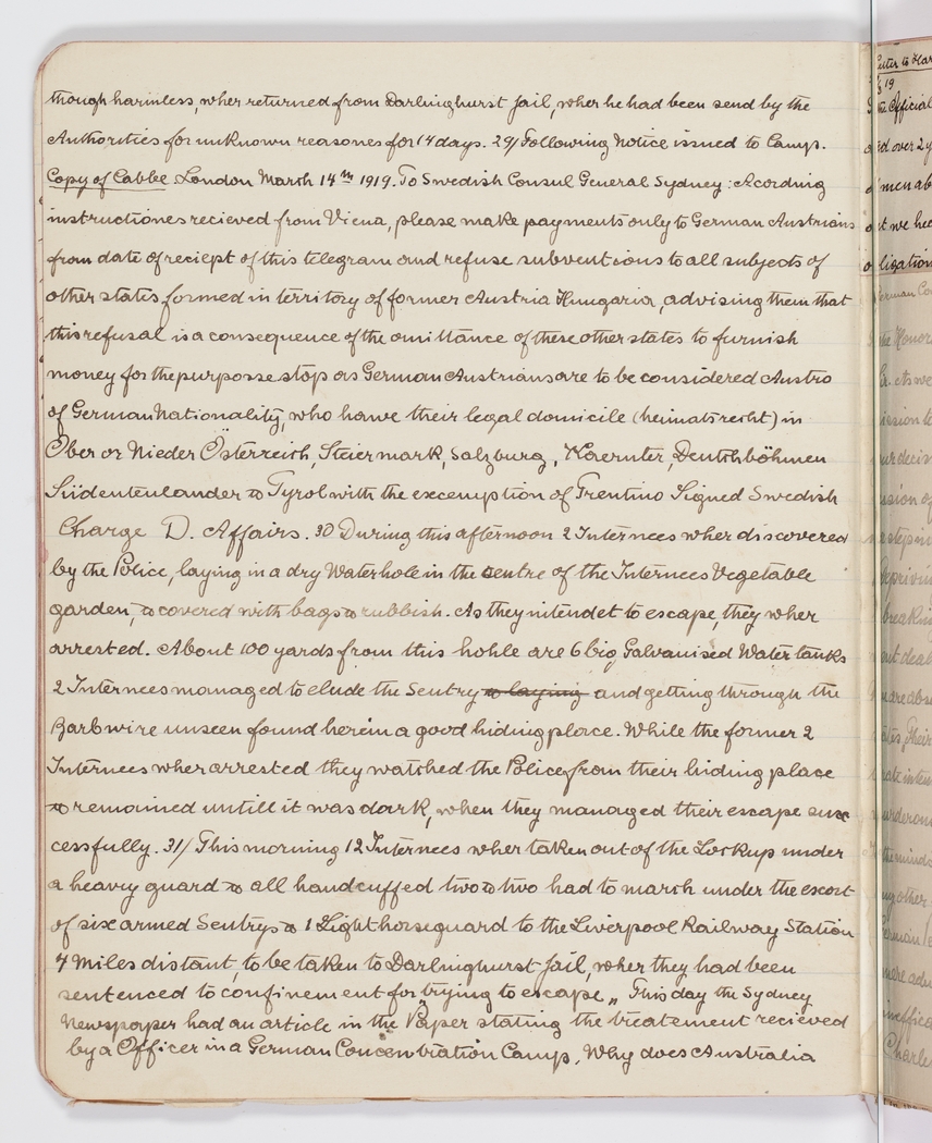though harmless, wher returned from Darlinghurst Jail, wher he had been sent by the Authorities for unknown reasons for 14 days. 29/ Following Notice issued to Camp. Copy of Cablee. London March 14th 1919. To Swedish Consul General Sydney. Acording instructiones received from Viena, please make payments only to German Austrians from date of reciept of this telegram and refuse subventions to all subjects of other states formed in territory of former Austria Hungaria, advising them that this refusal is a consequence of the omittance of these other states to furnish money for the purporse stop as German Austrians are to be considered Austro of German Nationality, who have their legal domicile (heimatsrecht) in Ober or Nieder Osterreich, Steiermark, Salzburg,Kaeruter, Deutchbohmen Ludentenlander & Tyrol with the exemption of Grentino Signed Swedish Charge D. Affairs. 30 During the afternoon 2 Internees wher discovered by the Police, laying in a dry Waterhole in the centre of the Internees Vegetable garden, & covered with bags & rubbish. As they intended to escape, they wher arrested. About 100 yards from this hohle are 6 big Galvanised Water tanks 2 Internees managed to elude the Sentry ,strike>so laying and getting through the Barbwire unseen found herein a good hiding place. While the former 2 Internees wher arrested they watched the Police from their hiding place & remained untill it was dark, when they managed their escape successfully. 31/ This morning 12 Internees wher taken out of the Lockeys under a heavy guard & all handcuffed two & two had to march under the escort of six armed Sentrys & 1 Lighthorseguard to the Liver pool Railway Station 4 miles distant, to be taken to Darlinghurst Jail, wher they had been sentenced to confinement for trying to escape. This day the Sydney Newspaper had an article in the Paper stating the treatment recieved by a Officer in a German Concentration Camp. Why does Australia