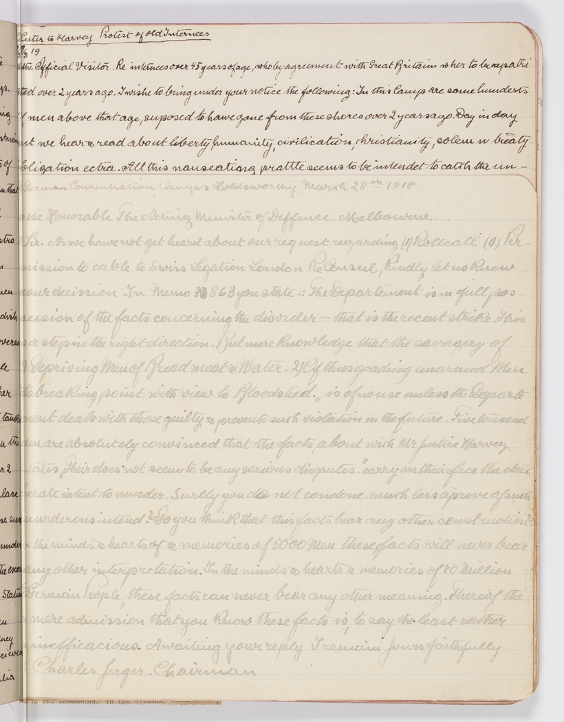 Sir. As we haive not yet heard about our request regarding (I) Rollcall (II) Permission to cable to Swiss Legation London Re Consul, Kindly let us Know your decision. In Memo 3 863 you state:: The Departement is in full possession of the facts concerning the disorder . . . that is the recent strike. This is a step in the right direction. But mere Knowledge that the savagery of 1) Depriving Men of Bread meat & Water. 2) Of thus goading unarmed Men to breaking point with view to Bloodshed. "is of no use unless the Department deals with those guilty & prevents such violation in the future. Five tousend Men are absolutely convinced that the facts, about wich Mr Justice Harvey states "Their does not seem to be any serious disputes", carry on their face the deliberate intent to murder. Surely you do not condone much less aprove of such murderous intend? Do you think that this facts bear any other construction? In the minds & hearts of & memories of 5000 Men these facts will never bear any other interpretation. In the minds & hearts & memories of 10 million German People, these facts can never bear any other meaning. Thereof the mere admission that you know these facts is, to say the least rather inefficacious. Awaiting your reply I remain Yours faithfully Charles Jerger. Chairman