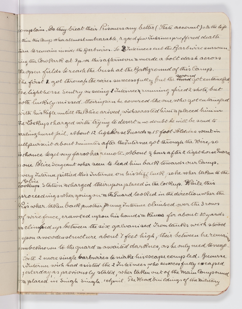 Complain. Do they treat their Prisoners any better (State account) As the life within this Camp wher allmost unbearable, a good few Internees preffered death than to remain inside the Barbwires. So 3 Internees cut the Barbwire surrounding the Cowpark at 3 p. m this afternoon & made a bolt dash across the open fields to reach the bush at the Bakground of this Camp. The first 1 got through the wires suxcessfully, but the third second got entangled. The lighthorse Sentry on seeing 1 Internee running fired 2 shots, but both lurkily missed. theirupon he covered the one who got entangled with his Rifle untill the Police arived, wich arrested him & placed him in the Lockeys charged with trying to desert & no doubt he will be sent to Darlinghurst Jail. About 12 lighthorse Guards & 15 foot Soldiers went in full pursuit about 3 minutes after the Internee got through the Wire, so his chance to get very far wher remote. About ½ hour after 2 lighthorse Guards & one Police Sergeant wher seen to lead him back towards our Camp. Every Internee pittied this Internee on his stiff luck, so he wher taken to the lockup Police Station & charged theirupon placed in the lockup. While this proceedings wher going on & the Guard looked in the direction wher the Pris wher taken back another young Internee climbed over the 3 rows of wire fence, crawled upon his hands & knees for about 30 yards & climbed up between the six galvanised Frontanks wich stood upon a wooden structure about 7 feet high, their between he remained unbeknown to the guard & awaited darkness, as he only need to negotiate 2 more single barbwires to make his escape compled. Becourse n Internee wich had asisted the 2 Internees, who suxcesfully escaped yesterday, as previously stated, wher taken out of the Main Compound & placed in Singh Singh. 1 April. The Headbuildings of the Military