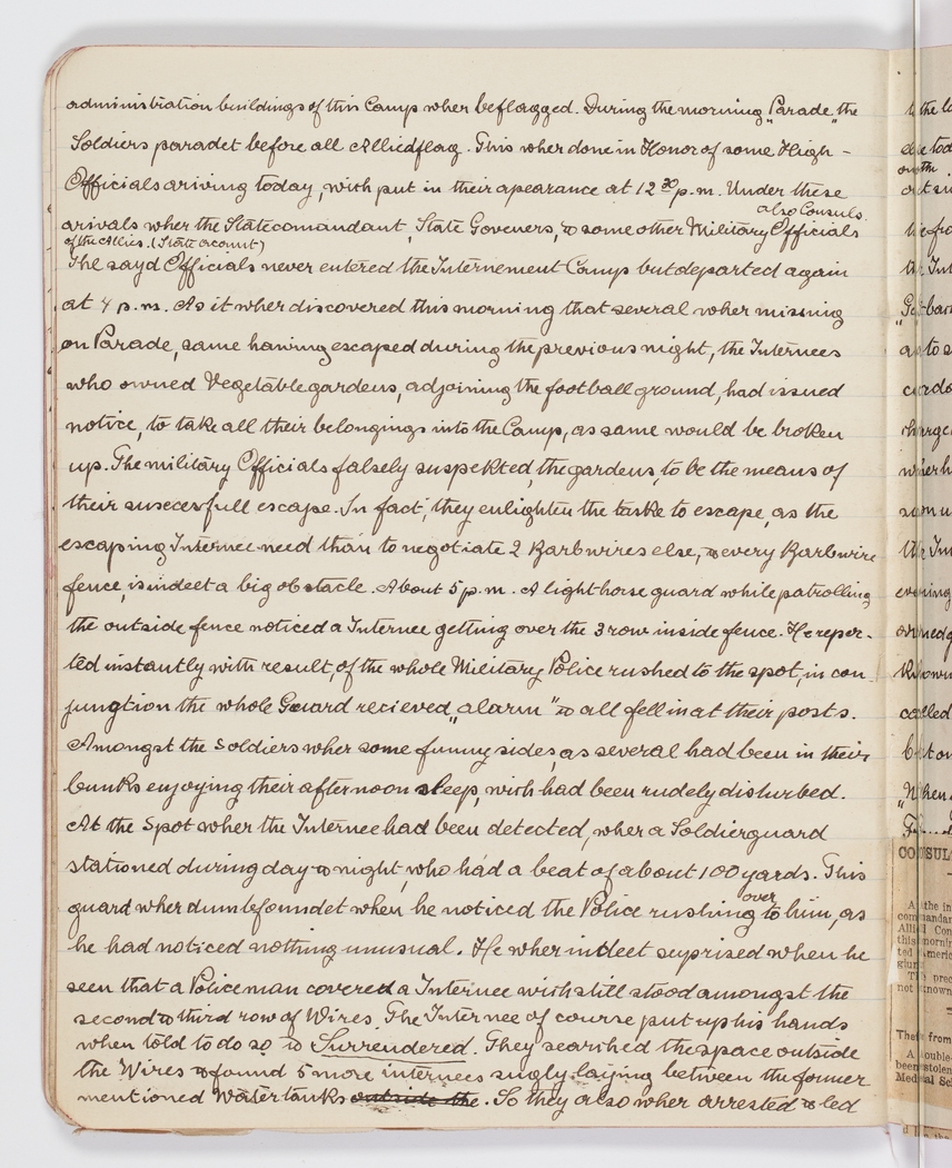 administration buildings of this Camp wher beflagged. During the morning "Parade" the Soldiers Paradet before all Alliedflag. This wher done in Honor of some High-Officials ariving today, wich put in their apearance at 12. 30 p. m. Under these arivals wher the State comandant, State Goveners, & some other Military Officials also Consuls of the Allies, (State acount) The sayd Officials never entered the Internement Camp but departed again at 4 p. m. As it wher discovered this morning that several wher missing on Parade, same having escaped during the previous night, the Internees who owned Vegetablegardens, adjoining the football ground, had issued notice, to take all their belongings into the Camp, as same would be broken up. The Military Officials falsely suspekted, the gardens, to be the means of their susecesfull escape. In fact, they enlighten the taske to escape, as the escaping Internee need those to negotiate 2 Barbwires else, & every Barbwire fence, is indeet a big obstacle. About 5 p. m. A light horse guard while patrolling the outside fence noticed a Internee getting over the 3 row inside fence. He reported instantly with result, of the whole Military Police rushed to the spot, in congunction the whole Guard recieved "alarm" & all fell in at their posts. Amongst the Soldiers wher some funny sides, as several had been in their bunks enjoying their afternoon sleep, wich had been rudely disturbed. At the Spot wher the Internee had been detected, wher a Soldierguard stationed during day & night, who had a beat of about 100 yards. This guard wher dumbfoundet when he noticed the Police rushing over to him, as he had noticed nothing unusual. He wher indeet suprised when he seen that a Policeman covered a Internee wich still stood amongst the second to third row of Wires. The Internee of course put up his hands when told to do so & Surrendered. They searched the space outside the Wires & found 5 more internees singly laying between the former mentioned Water tanks outside the. So they also wher arrested & led
