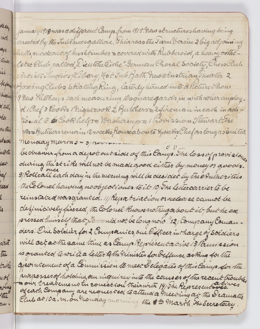 January 1919 was a different Camp from 1915. New structures having being erected by the Internees galore. Their was the Gurn Vereiu 2 big adjoining hills, made out of bushtimber & covered with Rubberoid, a heavy Atheletic C;ub, called Deutche Eiche" German Choral Society, Chess Club Artists Studios, Libery, Hot Tub Bath, New Austrian Theater 2 Boxing Clubs, Skating Ring, latterly turned into a Picture Show 3 New Kitchens each measuring 10 squareyards, in wich were employed 1 Chef 2 Cooks 1 Nightcook 2 Butchers & 2 fireman in each in adition to Cook helps & Washersup & 1 Provission Stewart. The Cooks & Butchers remain 12 weeks, Rouseabouts 4 weeks Chefs as long as suited
