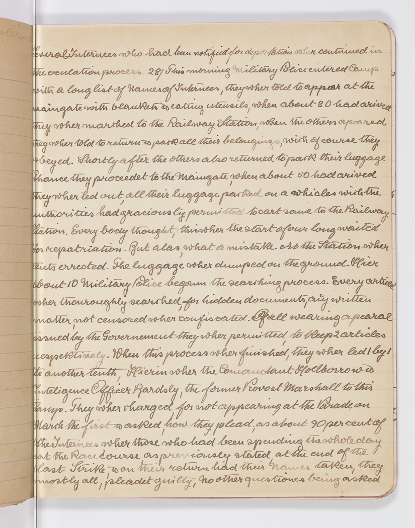 28/ This morning Military Police entered Camp with a long list of Names of Internees, they wher told to appear at the maingate with blankets & eating utensils, when about 80 had arived they wher marched to the Railway Station, when the others apeared they wher told to return & park all their belongings, wich of course they obeyed. Shortly after the others also returned to park their luggage Thance they proceedet to the to the Maingate, when about 50 had arived they wher led out, all their luggage parked on a vehicle wich the authorities had graciously permitted to cart same to the Railway Station. Every body thought, this wher the start of our long waited for repatriation. But alas, what a mistake. At the Station wher huts errected. The luggage wher dumped on the ground. Hier about 10 Military Police began the searching process. Evey article wher thoroughly searched, for hidden documents, any written matter, not censored wher confiscated. Of all wearing apearal issued by the Government they wher permitted, to keep 2 articles respektively. When this process wher finished, they were led 1 by 1 to another tenth, Hierin wher the Comandant Hollborrow & Inteligence Officer Bardsly, the former Provost Marshall to this Camp. They wher charged for not appearing at the Parade on March the first & asked, how they plead; as about 90 per cent of the Internees wher those who had been spending the whole day at the Racecourse, as previously stated, at the end of the last Strike, & on their return had their Names taken, they mostly all, pleadet guilty, no other questiones being asked