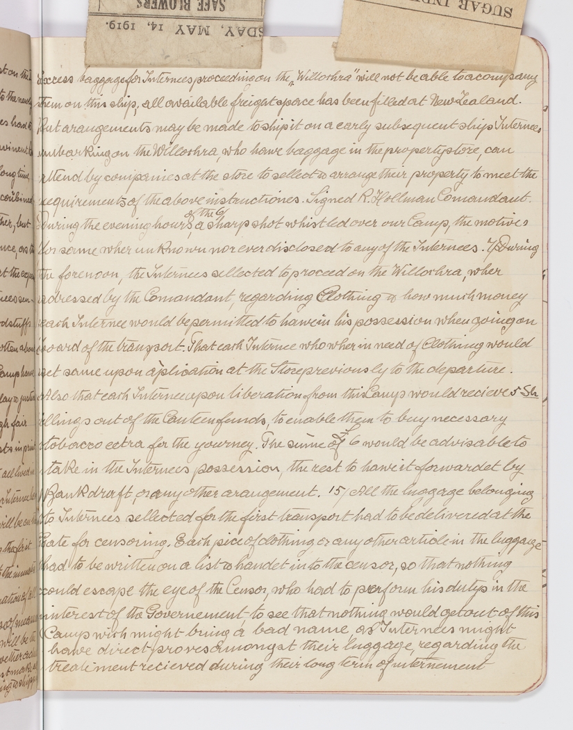 excess baggage for Internees proceeding on the "Willochra" will not be able to acompany them on this ship, all available freight space has been filled at New Zealand. But arangements may be made to ship it on a early subsequent ship Internees embarking on the Willochra, who hawe baggage in the propertystore, can attend by companies at the store to sellect & arrange their property to meet the requirements of the above instructiones. Signed R. Hollman Comandant. During the evening hours of the 6/, a sharp shot whistled over our Camp, the motives for same wher unknown nor even disclosed to any of the Internees. 7/ During the forenoon, the Internees sellected to proceed on the Willochra, wher adressed by the Comandanat, regarding Clothing & how much money each Internee would be permitted to hawe in his possession when going on board of the transport. That each Internee who wher in need of Clothing would get same upon aplication at the Store previously to the departure. Also that each Internee upon liberation from this Camp would recieve 5 Shillings out of the Canteen funds, to enable them to buy necessary tobacco ectra for the journey. The sume of & pound; 6 would be advisable to take in the Internees possession, the rest to hawe it forwardet by Bank draft, or any other arangement. 15/ All the luggage belonging to Internees sellected for the first transfer had to be delivered at the Gate for censoring. Each piece of clothing or any other article in the luggage had to be written on a list & handet into the censor, so that nothing could escape the eye of the Censor, who had to perform his dutys in the interest of the Government, to see that nothing would get out of this Camp wich might bring a bad name, as Internees might hawe direct proves amongst their luggage, regarding the treatment recieved during their long term of internment