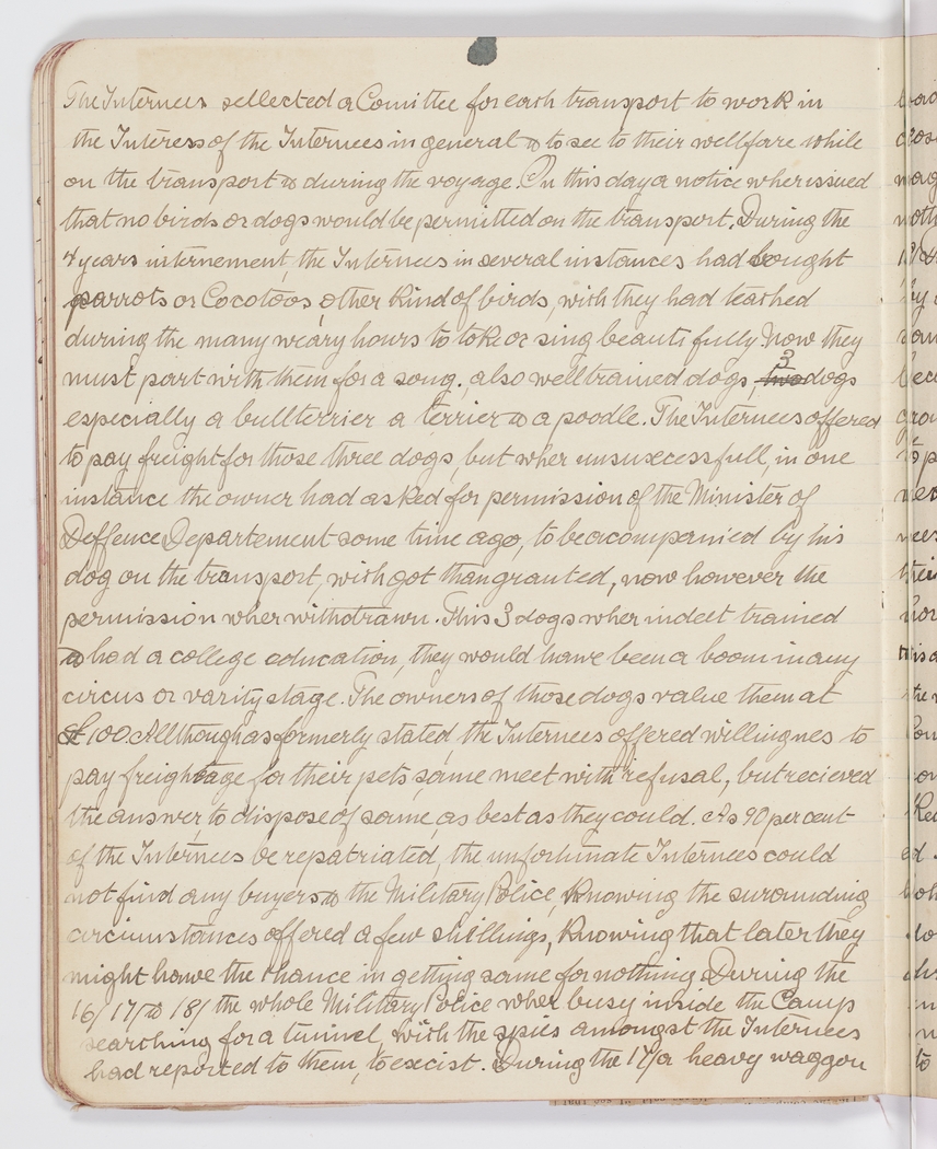 The Internees sellected a Comittee for each transport to work in the Interess of the Internees in general & to see to their welfare while on the transport & during the voyage. On this day a notice wher issued that no birds or dogs would be permitted on the transport. During the 4 years internment, the Internees in several instances had bought parrots or Cocotoos, other kinds of birds, wich they had teached during the many weary hours to toke or sing beautifully. Now they must part with them for a song. also well trained dogs, two 3 dogs especially a bullterrier a terrier & a poodle. The Internees offered to pay freight for those three dogs, but wher unsuxcessfull, in one instance the owner had asked for permission of the Minister of Deffence Departement some time ago, to be acompained by his dog on the transport, wich got then granted, now however the permission wher withdrawn. This 3 dogs wher indeet trained & hod a college education, they would have been a boom in any circus or varity stage. The owners of those dogs value them at & pound; 100. Allthough as formerly stated, the Internees offered willingnes to pay freightage for their pets, same meet with refusal, but recieved the answer, to dispose of same, as best they could. As 90 per cent of the Internees be repatriated, the unfortunate Internees could not find any buyers & the Military Police, knowing the surounding circumstances offered a few shillings, knowing that later they might hawe the chance in getting same for nothing. The 16/ 17/ & 18/ the whole Military Police wher busy inside the Camp searching for a tunnel, wich the spies amongst the Internees had reported to them, to excist. During the 17/ a heavy wagon