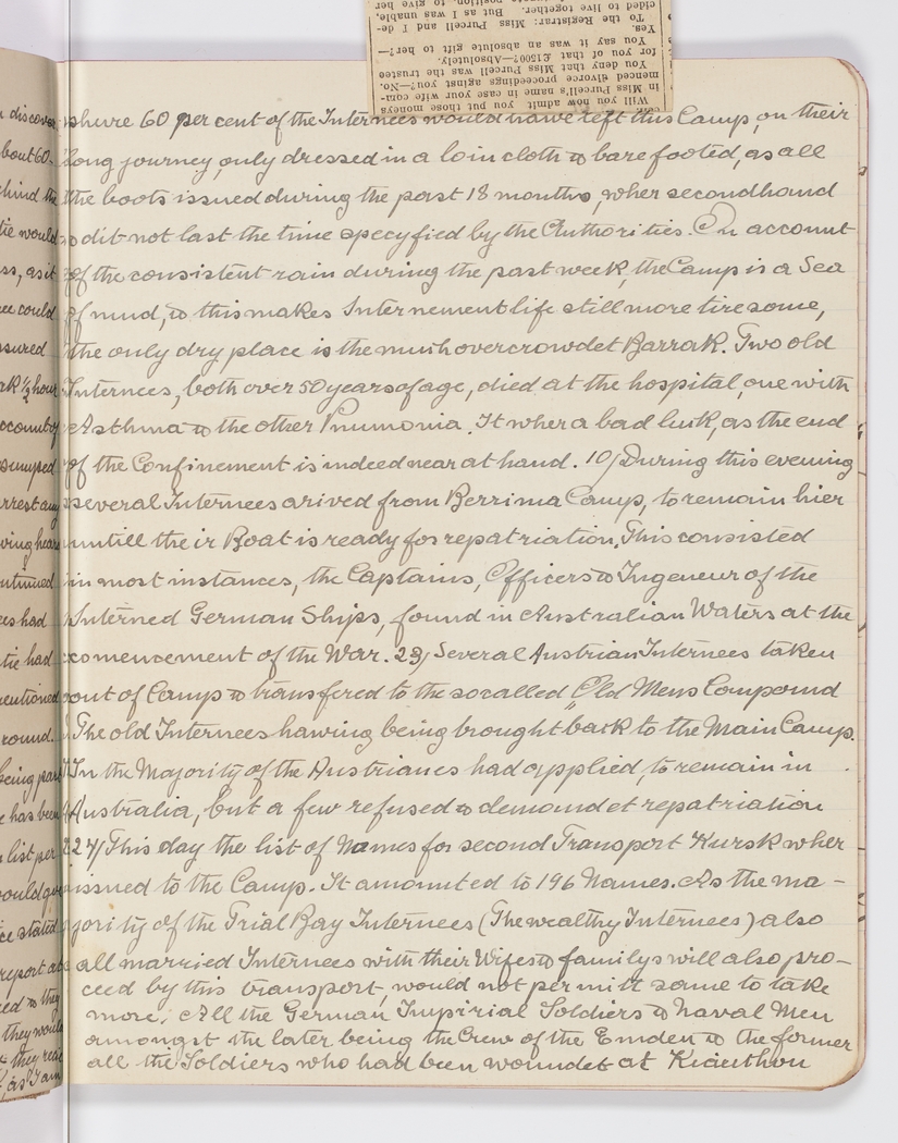 sure 60 per cent of the Internees would hawe left this Camp, on their long journey, only dressed in a loin cloth & barefooted, as all the boots issued during the past 18 months, wher secondhand & did not last the time specyfied by the Authorities. On account of the consistent rain during the past week, the Camp is a Sea of mud, & this makes Internment life still more tire some, the only dry place is the much overcrowded Barrack. Two old Internees, both over 50 years of age, died at the hospital, one with Asthma & the other Pnumonia. It wher a bad luck, as the end of the Confinement is indeed near at hand. 10/ During this evening several Internees arived from Berrima Camp, to remain hier untill their Boat is ready for repatriation. This consisted in most instances, the Captains, Officers & Ingeneur of the Interned German Ships, found in Australian Waters at the comencement of the War. 23/ Several Austrian Internees taken out of Camp & transfered to the so called "Old Mens Compound The old Internees hawing being brought back to the Main Camp. In the Majority of the Austrianes had applied, to remain in Australia, but a few refused & demandet repatriation 27/ This day the list of Names for second Transport Kursk wher issued to the Camp. It amounted to 196 Names. As the majority of the Trial Bay Internees (The wealthy Internees) also all married Internees with their Wifes & familys will also proceed by this transport, would not permitt same to take more. All the German Imperial Soldiers & Naval Men amongst the later being the Crew of the Emden & the former all the Soldiers who had been wounded at Kiauthou