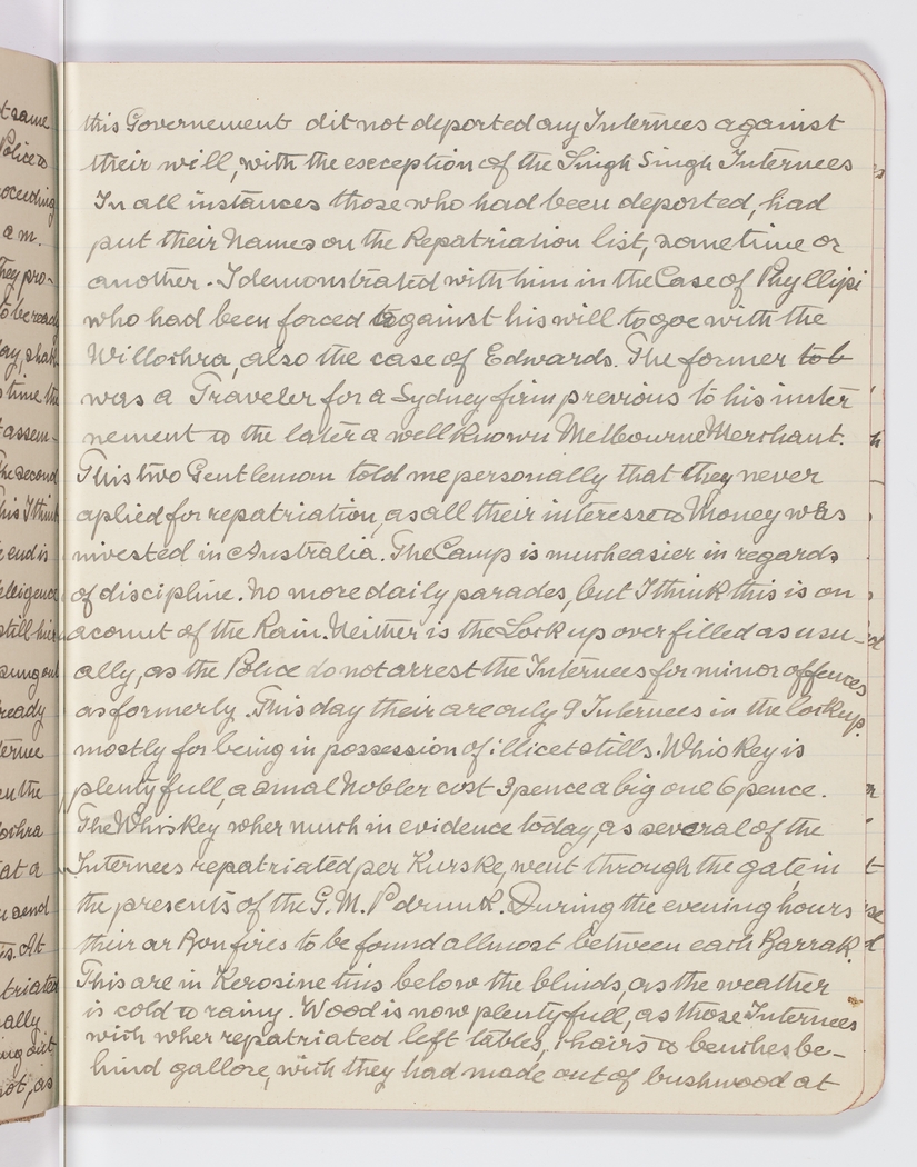 this Government did not deported any Internees against their will, with the exception of the Singh Singh Internees In all instances those who had been deported, had put their Names on the Repatriation list, sometime or another. I demonstrated with him in the Case of Phyllipe who had been forced against his will to goe with the Willochra, also the case of Edwards. The former to b was a Traveler for a Sydney firm previous to his internment & the later a well known Melbourne Merchant. This two Gentleman told me personally that they never aplied for repatriation, as all their interesse & Money was invested in Australia. The Camp is much easier in regards of discipline. No more daily parades, but I think this is on acount of the Rain. Neither is the Lock up over filled as usually, as the Police do not arrest the Internees for minor offences as formerly. This day their are only 9 Internees in the lockup, mostly for being in possession of illicet stills. Whiskey is plenty full, a smal Nobler cost 3 pence a big one 6 pence. The Whiskey wher much in evidence today, as several of the Internees repatriated per Kurske, went through the gate in the presents of the G. M. P drunk. During the evening hours their ar Bonfires to be found allmost between each Barrack. This are in Kerosine tins below the blinds, as the weather is cold & rainy. Wood is now plentyfull, as those Internees wich wher repatriated left tables, chairs & benches behind galore, wich they had made out of bushwood at