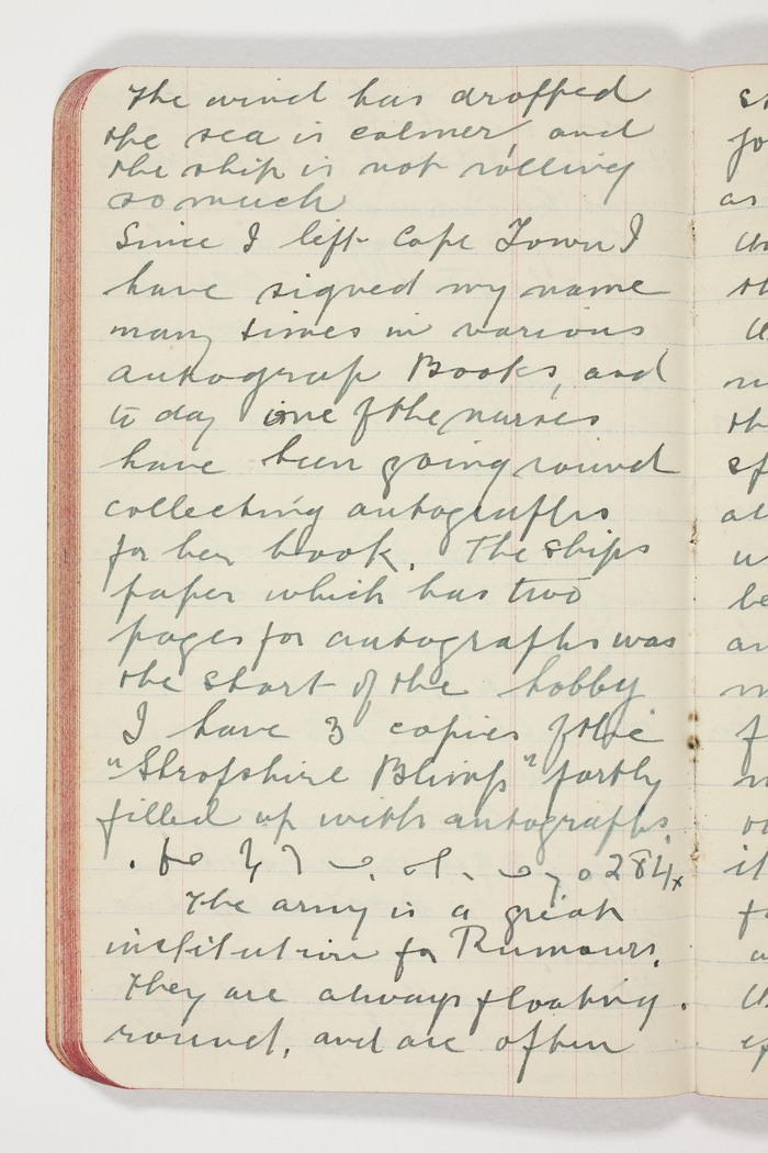 Since I left Cape Town I have signed my name many times in various autograph books and today one of the nurses have been going round collecting autographs for her book. The ships paper which has two pages for autographs was the start of the hobby. I have 3 copies of the "Shropshire Blimp" partly filled up with autographs.