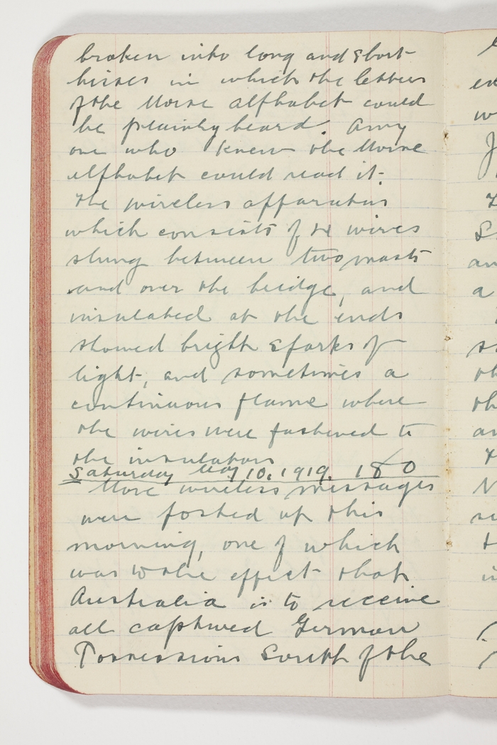 more wireless messages were posted up this morning, one of which was to the effect that Australia is to receive all captured German possessions south of the Equator with the exception of Samoa which goes to New Zealand. Japan is to receive all those North of the Equator. Today is fine. The sun is shining out bright and warm. In fact it is a typical Australian day.