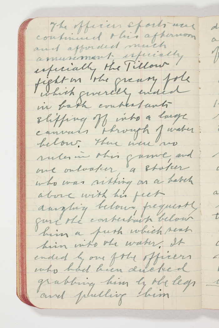 The officers sports were continued this afternoon and afforded much amusement especially the pillow fight on the greasy pole which generally ended in both combatants slipping off into a large canvas trough of water below. There were no rules in this game, and one onlooker, a stoker who was sitting on a hatch above with his feet dangling below, frequently gave the contestant below him a push which sent him into the water. It ended by one of the officers who had been ducked grabbing him by the legs and pulling him down into the water admidst the laughter of the crowd.