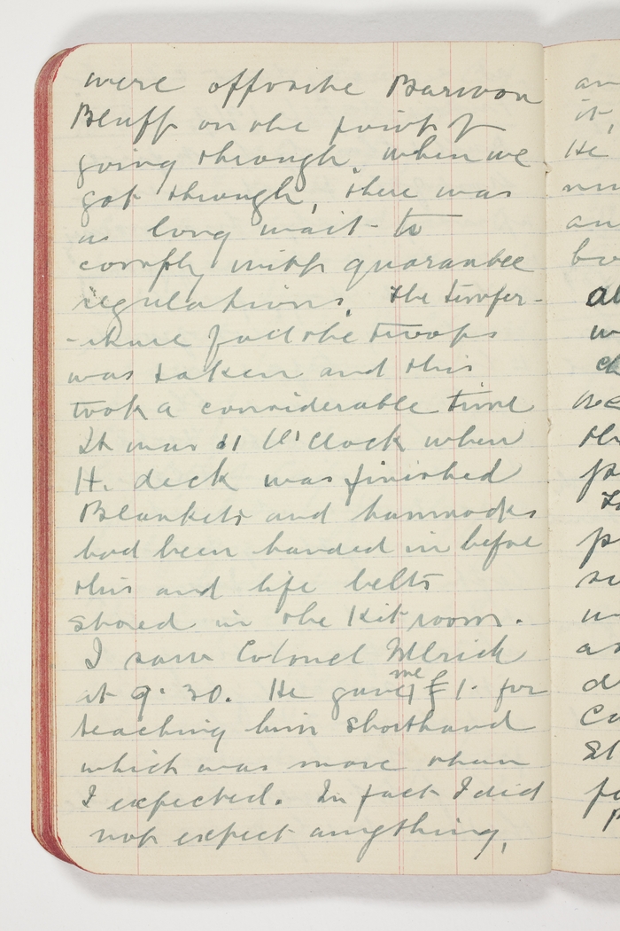 were opposite Barwon Bluff on the point of going through. When we got through, there was a long wait to comply with quarantine regulations. The temperature of all the troops was taken and this took a considerable time. It was 11 o'clock when H deck was finished. Blankets and hammocks had been handed in before this and life belts stored in the kit room. I saw Colonel Melrick at 9.30. He gave me £1 for teaching him shorthand which was more than I expected. In fact I did not expect anything, and did not want to take it, but he insisted. He also collected a number of high officers autographs for my book.