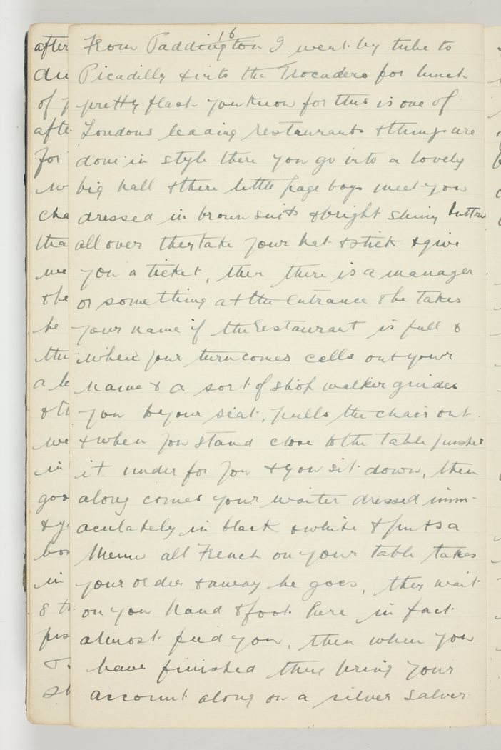 From Paddington I went by tube to Picadilly & into the Trocadero for lunch, pretty flash you know for this is one of London's leading restaurants & things are done in style there, you go into a lovely big hall & there little page boys meet you dressed in brown suits & bright shiny buttons all over they take your hat & stick & give you a ticket, then there is a manager or something at the entrance & he takes your name if the restaurant is full & when your turn comes calls out your name & a sort of shop walker guides you to your seat, pulls the chair out & when you stand close to the table pushes it under for you & you sit down, then along comes your waiter dressed immaculately in black & white & puts a menu all French on your table takes your order & away he goes. They wait on you hand & foot here in fact almost feed you, then when you have finished they bring your account along on a silver salver