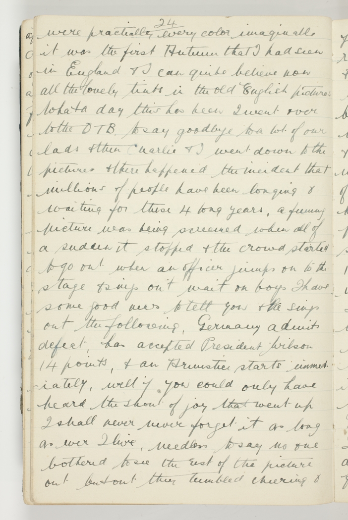 were practically every color imaginable. It was the first Autumn that I had seen in England & I can quite believe now all the lovely tints in the old English pictures. What a day this has been I went over to the D.T.B. to say goodbye to a lot of our lads & then Charlie & I went down to the pictures & there happened the incident that millions of people have been longing & waiting for these 4 long years, a funny picture was being screened when all of a sudden it stopped & the crowd started to go out when an officer jumps on to the stage & sings out wait on boys I have some good news to tell you & he sings out the following, Germany admits defeat, has accepted President Wilson 14 points, & an Armistice starts immediately, well if you could only have heard the shout of joy that went up I shall never never forget it as long as ever I live. Needless to say no one bothered to see the rest of the picture out but out they tumbled cheering &
