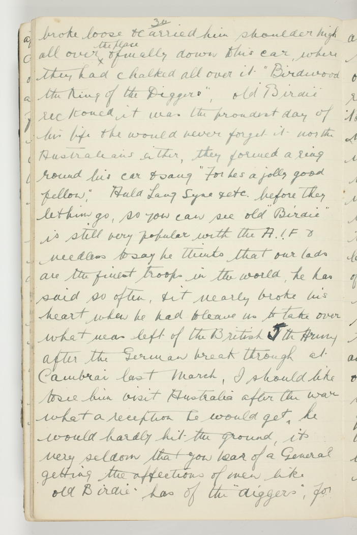broke loose & carried him shoulder high all over the place & finally down to his car where they had chalked all over it "Birdwood the King of the Diggers", old Birdie reckoned it was the proudest day of his life & he would never forget it nor the Australians either. They formed a ring round his car & sang "For hes a jolly good fellow", Auld Lang Syne & etc. before they let him go, so you can see old "Birdie" is still very popular with the A.I.F. & needless to say he thinks that our lads are the finest troops in the world. He has said so often, & it nearly broke his heart when he had to leave us to take over what was left of the British 5th Army after the German break through at Cambrai last March. I should like to see him visit Australia after the war, what a reception he would get. He would hardly hit the ground. Its very seldom that you hear of a General getting the affection of men like old "Birdie" has of the "diggers", for
