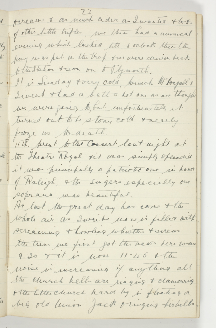 11th. Went to the Concert last night at the Theatre Royal & it was simply splendid it was principally a patriotic one in honor of Raleigh, & the singers especially one soprano was beautiful.