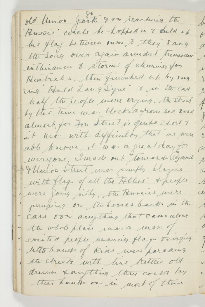 old Union Jack & on reaching the "Aussie" circle he hopped in & held up his flag between ours & they sang the song over again amidst tremendous enthusiasm & storms of cheering for Australia. They finished up by singing "Auld Lang Syne" & in the end half the people were crying, the street by this time was blocked from end to end almost, for Fore Street is quite short & it was with difficulty that we were able to move, it was a great day for everyone. I made out towards Plymouth & Union Street was simply blazing with flags of all the "Allies" & people were going silly. The Aussies were jumping on the horses backs in the cars & on anything that came along, the whole place was a mass of excited people waving flags & singing, little bands of kids were parading the streets with tins Kettles old drums & anything they could lay their hands on, in most of these