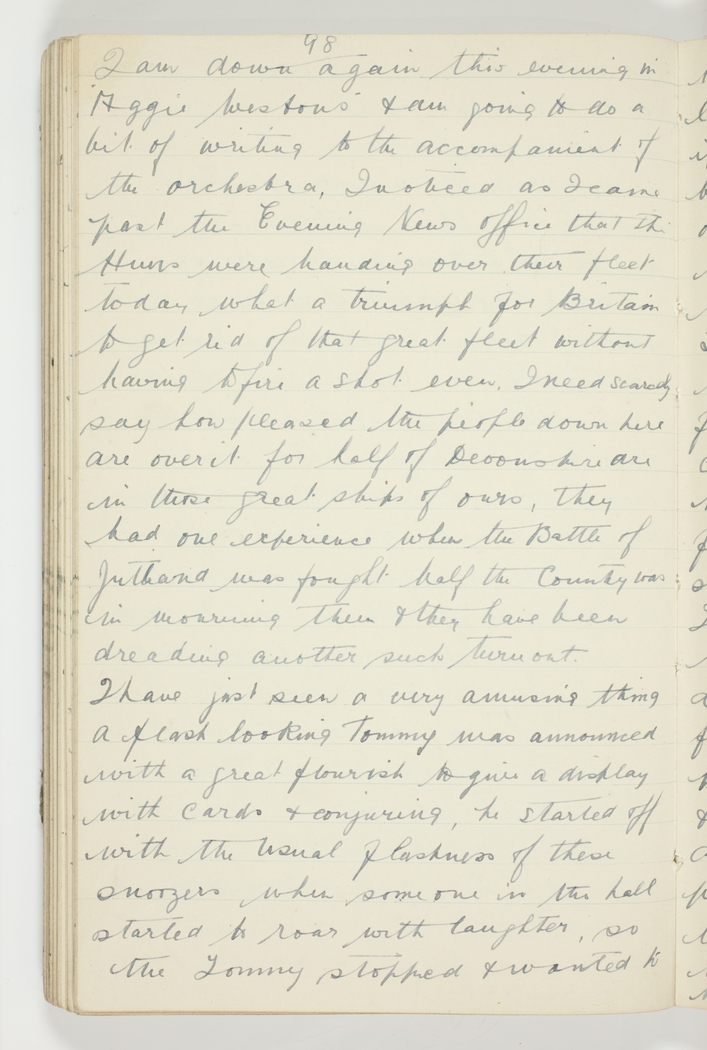 I am down again this evening in "Aggie Westons" & am going to do a bit of writing to the accompaniment of the orchestra. I noticed as I came past the Evening News office that the Huns were handing over their fleet today, what a triumph for Britain to get rid of that great fleet without having to fire a shot even, I need scarcely say how pleased the people down here are over it for half of Devonshire are in those great ships of ours, they had one experience when the Battle of Jutland was fought half the Country was in mourning then & they have been dreading another such turnout.
