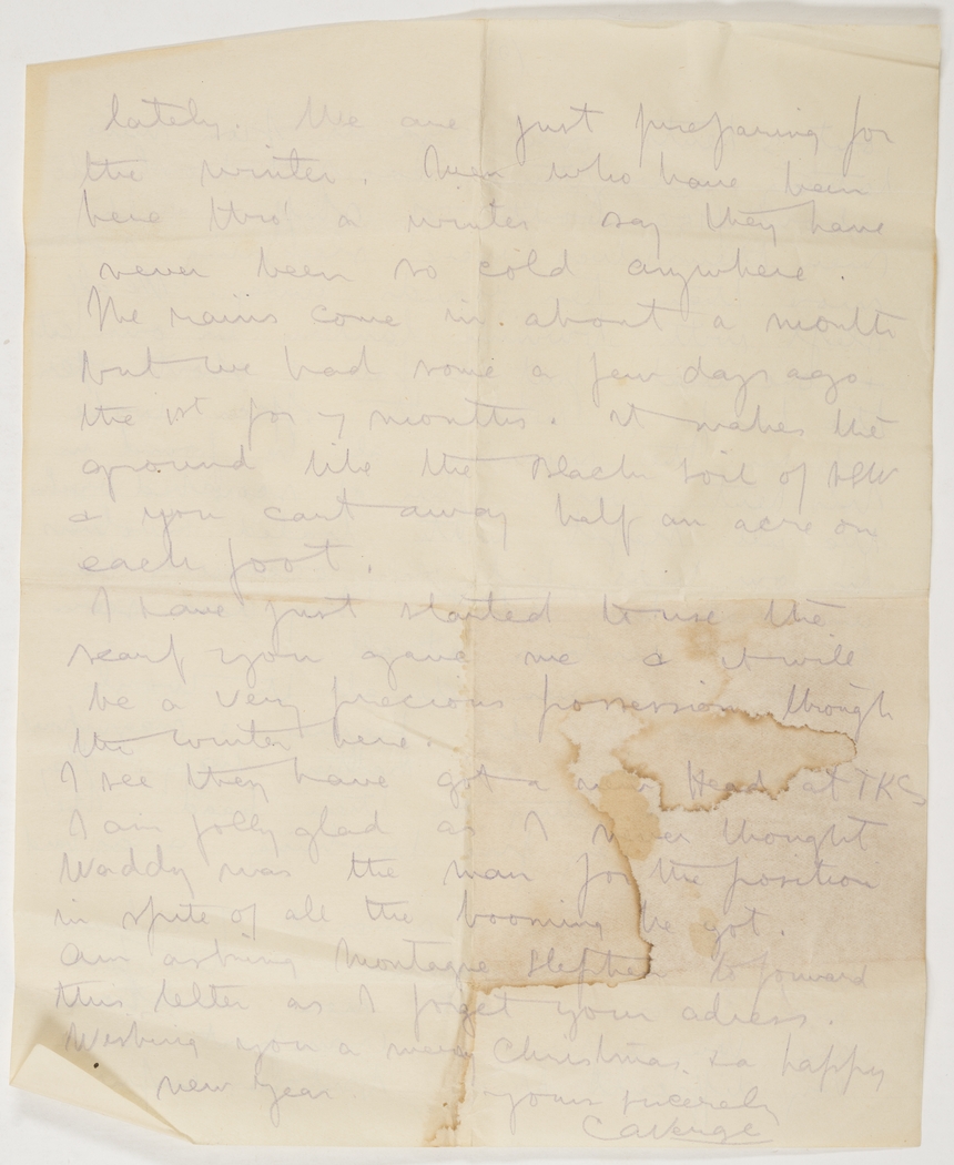 lately. We are just preparing for the winter. Men who have been here thro' a winter say they have never been so cold anywhere. The rains come in about a month but we had some a few days ago, the 1st for 7 months. It makes the ground like the Black soil of N.S.W. & you cart away half an acre on each foot.