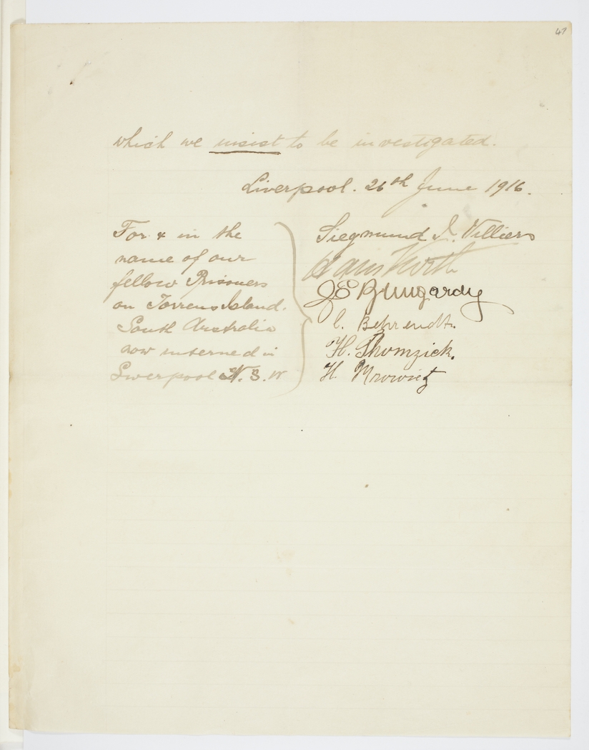 For & in the name of our fellow Prisoners on Torrens Island, South Australia now interned in Liverpool N.S.W
