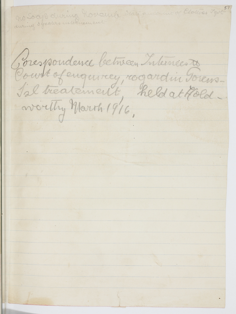 Correspondence between Internees & Court of enquiry, regarding Torens Isl treatment, held at Holsworthy March 1916.