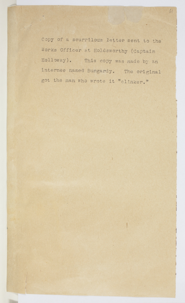 Copy of scurrilous letter sent to the Works Officer at Holdsworthy (Captain Holloway). This copy was made by an internee named Bungardy. The original got the man who wrote it "clinker"