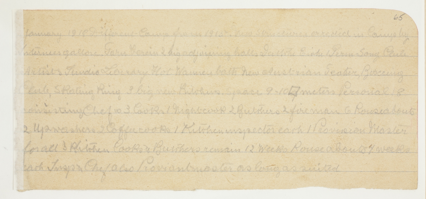January 1918 Different Camp from 1913. New structures erected in Camp by Internees galore. Farm therein 2 big adjoining halls. [indecipherable]. 1 Perm Song Club Artists Studio Laundry Hot warmers, bath New Austrian [indecipherable], Boxing Club, Skating Ring 3 big new Kitchens. Space 9-10 sq meters Personal 18 consisting Chef w 3 cooks 1 nightcook 2 butchers 2 fireman 6 Rouseabouts 2 upwashers 2 coffeecooks 1 Kitchen inspector each 1 Provision Master for all 3 Kitchens Cooks & Butchers remain 12 weeks Rouseabouts 4 weeks each Insp Chef also Provisionmaster as long as suited