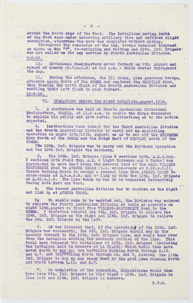 - Instructions were issued for the Third Australian Division and the Fourth Australian Division to carry out an encircling operation on night 10th/11th. August; so as to cut off the ETINEHEM Spur North of the SOMME and the Ridge East of PROYART South of the SOMME. The 13th. Inf. Brigade was to carry out the Northern operation and the 10th Inf. Brigade the Southern.