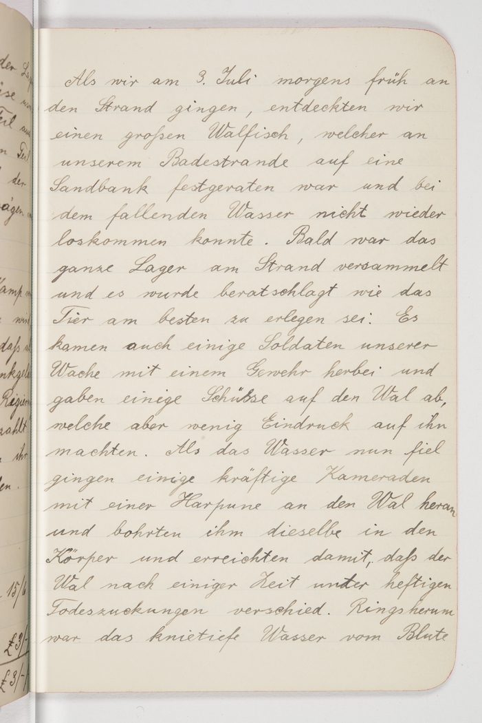 <p>[Page 100]</p><p>When we went to the beach early on 3rd of July we discovered a huge whale trapped on a sandbank near our beach because of the low tide. Soon the whole camp had gathered at the beach and was debating how best to kill the animal. A few of the guards came along with their rifles and shot at the whale, but that made little impression. When the water was at its lowest, a few strong comrades approached the whale with a harpoon and began boring into it with the result that the whale died after prolonged agony. All around, the knee-deep water</p>