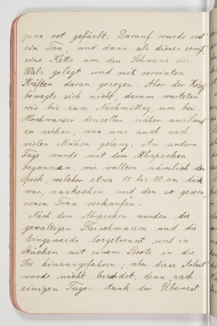 <p>[Page 101]</p><p>was stained blood red. They then wrapped a rope around its fin and when the rope broke, a chain, and began tugging with all their combined might. But the colossus wouldn't budge, so we waited until the afternoon and the return of the high tide to tow him ashore, which we finally managed after much effort. The next day we began skinning the whale, because we wanted to get to the blubber, which was about 15 to 20cm thick, so we could boil it and sell the thus produced fish oil. After harvesting the blubber we began to cut up the colossal carcass and the innards and take them out to sea in a boat; but we never finished the job because after a few days, the decomposing heap</p>