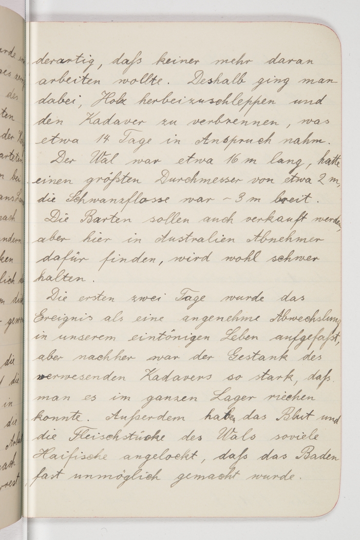 <p>[Page 102]</p><p>began to stink so horribly that nobody wanted to work on it anymore. Thus we began dragging along enough wood to burn the carcass, which took us about 14 days. The whale was about 16m long, its widest diameter was about 2m, and the fin was about 3m wide. The whalebone is to be sold as well, but here in Australia it might be hard to find buyers for it. For the first two days the event brought a welcome diversion to the monotony of our camp life, but then the reek from the carcass became so overpowering that we could smell it through the whole camp. Also, the blood and the pieces of whale meat in the water attracted so many sharks that swimming became virtually impossible.</p>