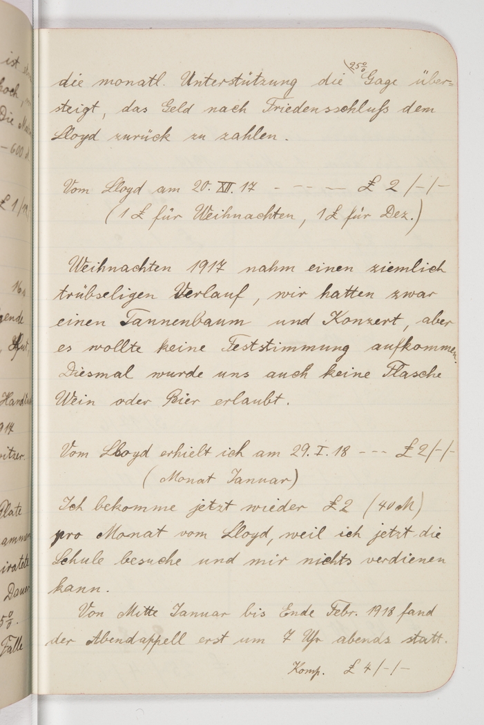 <p>[Page 108]</p><p>the monthly subsidy were to be greater than 25% of our wages, we would have to repay the difference at the end of the war.</p><p>From Lloyd on 20th/12/17: £2/-/- ( £1 for Christmas, £1 for December).</p><p>Christmas 1917 was a rather dismal affair; although we had a Christmas tree and a concert, there was no celebratory mood. This time we were not allowed any wine or beer.</p><p>I received £2 from Lloyd on 29th/1/18 (month of January).</p><p>I am given £2 (40M) a month again because I'm attending school and cannot earn extra money.</p><p>From mid-January to the end of February 1918 evening roll-call was not until 7pm.</p><p>[Note in Margin:] comp. £4/-/-</p>
