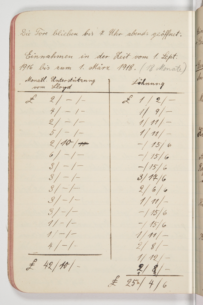<p>[Page 109]</p><p>The gates stayed open until 7pm.</p><p>Income in the period from September 1, 1916, to March 1, 1918 (18 months)</p><table border="1" cellpadding="1" cellspacing="1" style="width: 300px;"><tbody><tr><td>Monthly subsidy<br />from Lloyd</td><td>Salary</td></tr><tr><td> £ 2/-/-</td><td> £ 1/2/-</td></tr><tr><td> 4/-/-</td><td> 1/9/-</td></tr><tr><td> 2/-/-</td><td> 1/11/-</td></tr><tr><td> 5/-/-</td><td> 1/11/-</td></tr><tr><td> 2/10/-</td><td> -/15/6</td></tr><tr><td> 6/-/-</td><td> -/15/6</td></tr><tr><td> 3/-/-</td><td> -/15/6</td></tr><tr><td> 3/-/-</td><td> 3/17/6</td></tr><tr><td> 3/-/-</td><td> 2/6/6</td></tr><tr><td> 3/-/-</td><td> 1/11/-</td></tr><tr><td> 3/-/-</td><td> -/15/6</td></tr><tr><td> 1/-/-</td><td> -/15/6</td></tr><tr><td> 1/-/-</td><td> 1/11/-</td></tr><tr><td> 4/-/-</td><td> 2/8/-</td></tr><tr><td> £ 42/10/-</td><td> 1/12/-</td></tr><tr><td> </td><td> 2/8/-</td></tr><tr><td> </td><td> £25/4/6</td></tr></tbody></table><p> </p>