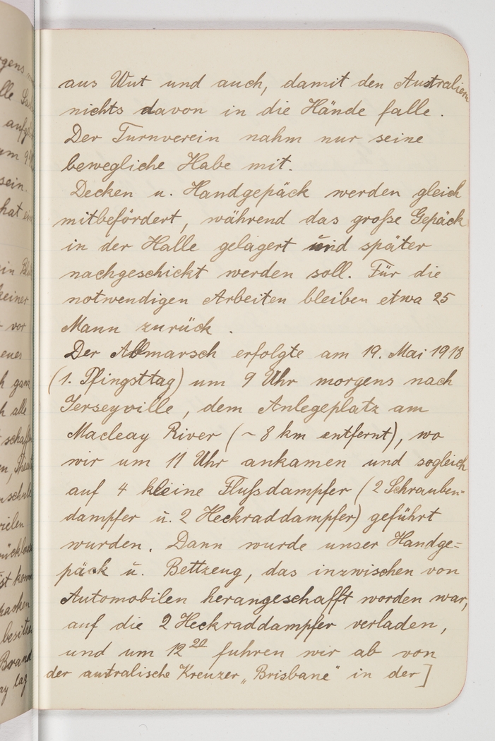 <p>[Page 112]</p><p>in frustration and also so as not to leave anything in the hands of the Australians. The gymnastic club only took along the movable objects. Blankets and hand luggage will be transported alongside us, whereas the larger luggage is being stowed in the hall and will be transported later on. About 25 men stay back for that job. We marched off on May 19, 1918 (Whitsunday) at 9am to Jerseyville, the pier on the Macleay River (about 8km from here), where we arrived at 11am and right away boarded 4 small river steamers (2 propeller steamers and 2 stern wheelers). Our hand luggage and the bed linen, which had been brought by car, was stowed on the 2 stern wheelers, and at noon</p>