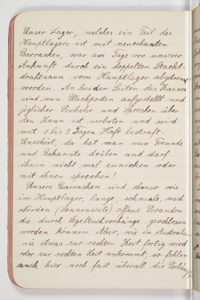 <p>[Page 115]</p><p>Our camp, which is part of the main camp but with newly built barracks, was cordoned off with a double barbed-wire fence the day before our arrival. On both sides of the fence guards are posted and any kind of communication across the fence is prohibited and punishable with 1 to 3 days&nbsp;gaol. Quite outrageous really if you have friends and acquaintances over there and can&#39;t even nod or speak to them! Our barracks, like those in the main camp, are long and narrow structures, no walls on the northern (sun-exposed) end and only a canvas curtain for protection. But since in Australia nothing ever gets done or delivered in time, almost all the curtains are still missing,</p>