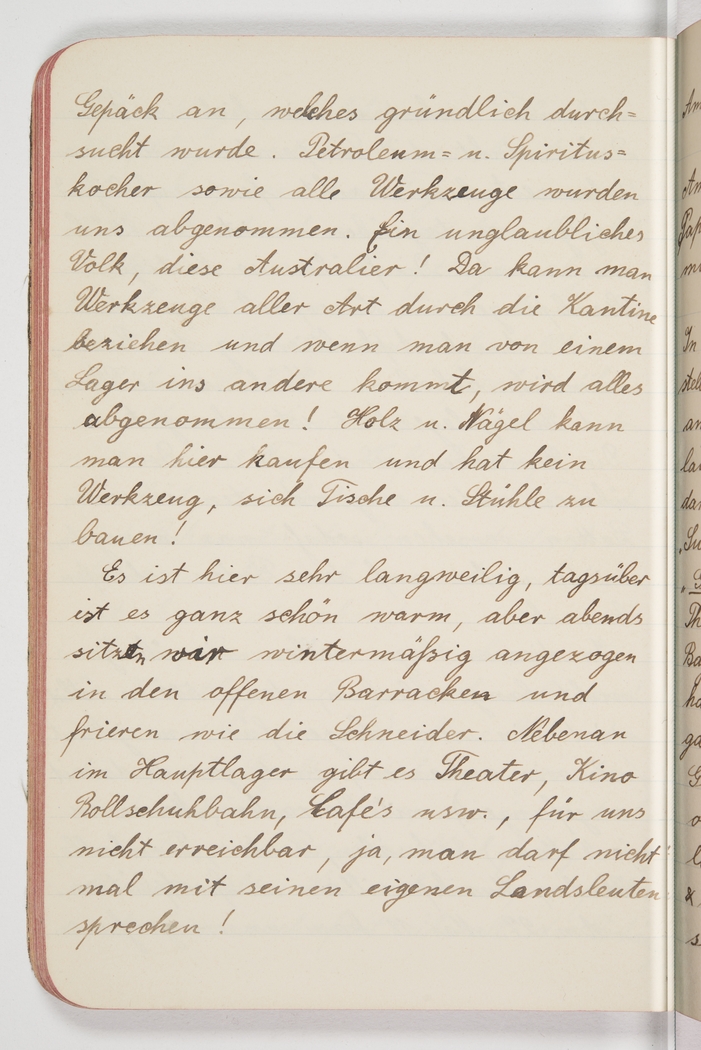 <p>[Page 117]</p><p>luggage arrived, which was thoroughly searched. They confiscated the petroleum and gas cookers and all tools. Unbelievable people, these Australians! One can get all sorts of tools from the canteen, but when you bring some from one camp to another, it all gets confiscated! You can buy timber and nails here but have no tools to build tables or benches! It's very boring here; during the day it's reasonably warm, but at night we're sitting here in the open barracks, dressed in winter gear and still trembling like lapdogs from the cold. Next door in the main camp they have a theatre, a cinema, a roller-skating rink, cafes, etc but all unreachable for us, hell, we can't even talk with our own countrymen!</p>